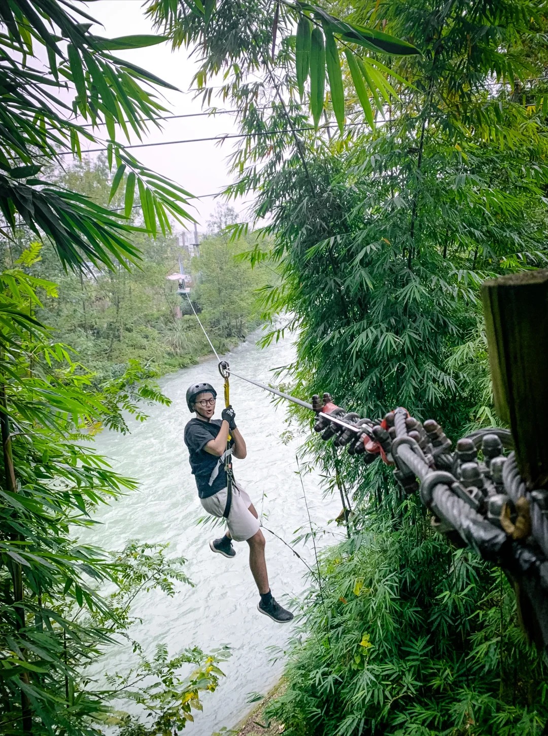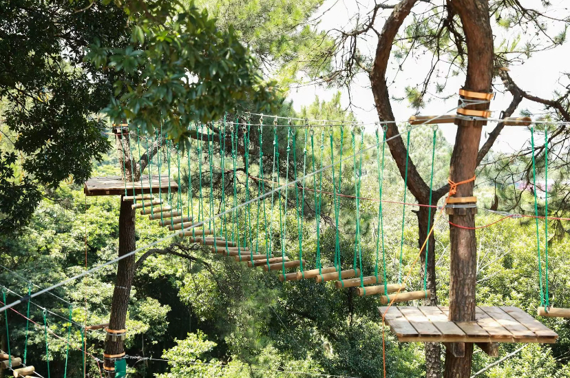 前往飞越丛林。飞越丛林 通过树木将各种各样的障碍。在整个运动中,汇集了高空、速度、力量、毅力等户外探险所必备的元素,为参与者提供了感官上的刺激。