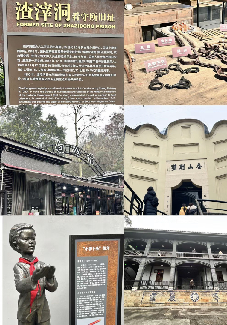 早餐后,游览渣滓洞(约1小时)渣滓洞原是重庆郊外的一个小煤窑,因渣多煤少而得名。渣滓洞三面是山,一面是沟,位置较隐蔽。1939年,国民党军统特务逼死矿主,霸占煤窑,在此设立了监狱。关押在此的有“六一”大逮捕案、“小民革”案、“挺进报”案、上下川东三次武装起义失败后被捕的革命者,此地还曾居住过“小萝卜头”和他们一家人。10:30 游览白公馆(约1小时)是一处缅怀英烈的革命遗迹,原为四川军阀白驹的郊外别墅,白驹自诩是白居易的后代,借用白居易别号“香山居士”,把别墅取名为“香山别墅”。1939年,军统特务头子戴笠用重金将它买下,改造为迫害革命者的监狱。