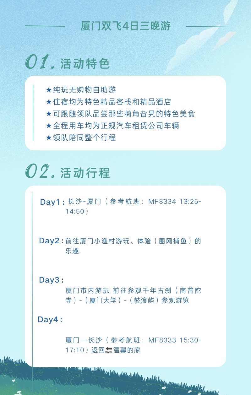 1、交通:长沙—厦门往返经济舱,含机场建设及燃油费;当地空调旅游大巴