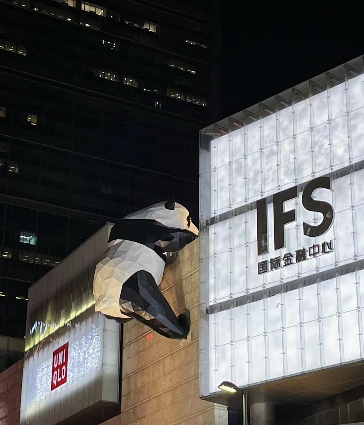 D2 打卡成都最火最网红的——【IFS“熊猫爬墙” 】独特的设计思路,让一个肥肥大大的大熊猫一半身体挂在商场的外边,一半身体爬上商场的花台,基本上你每天都能看到露天花台上排着队的人跟熊猫的大头拍照,然后商场旁边的步行街上一群人拿着相机对着熊猫的屁股拍照。 【成都远洋太古里】坐落成都中心地带,紧接春熙路地铁站,尽享优越交通和人流优势,比邻的千年古刹大慈寺更为其增添独特的历史和文化韵味。【方所】位于太古里地下一隅,与其说是一家书店,不如说它是一种装进文艺里的生活。