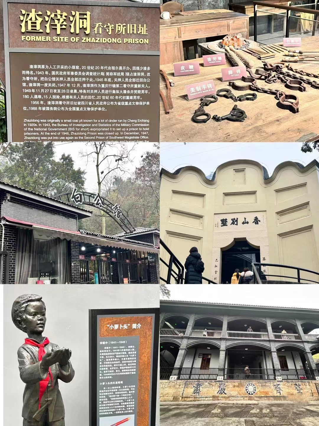早餐后,游览渣滓洞(约1小时)渣滓洞原是重庆郊外的一个小煤窑,因渣多煤少而得名。渣滓洞三面是山,一面是沟,位置较隐蔽。1939年,国民党军统特务逼死矿主,霸占煤窑,在此设立了监狱。关押在此的有“六一”大逮捕案、“小民革”案、“挺进报”案、上下川东三次武装起义失败后被捕的革命者,此地还曾居住过“小萝卜头”和他们一家人。10:30 游览白公馆(约1小时)是一处缅怀英烈的革命遗迹,原为四川军阀白驹的郊外别墅,白驹自诩是白居易的后代,借用白居易别号“香山居士”,把别墅取名为“香山别墅”。1939年,军统特务头子戴笠用重金将它买下,改造为迫害革命者的监狱。