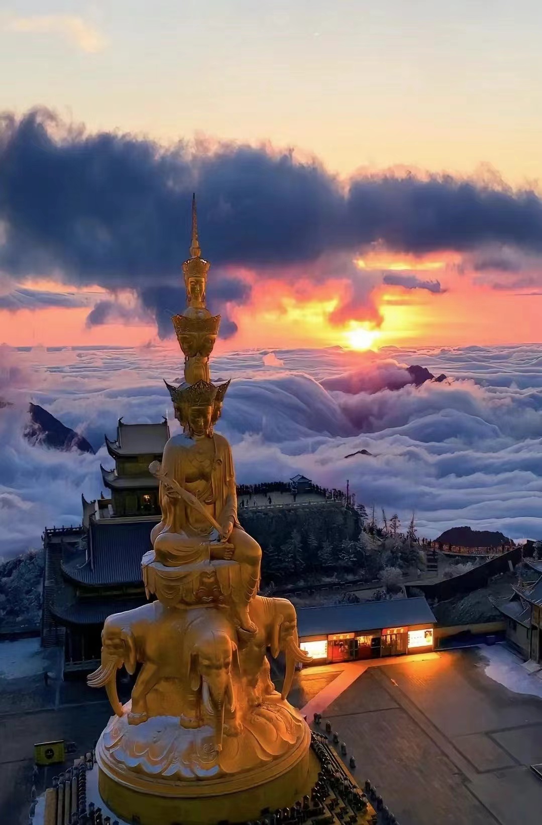14:00 游览峨眉山金顶(2小时)乘坐观光车至雷洞坪,徒步至接引殿。峨眉金顶是以一尊48米高的十方普贤铜像为中心,由耀日的金殿、雄浑的铜殿、灼灼的银殿和洁白的朝圣大道组成的新金顶。金顶为峨眉山游程的最高峰,其海拔为3077米。顶上是个小平原,原有铜殿一座,在太阳的照射下,光彩夺目,故而得名金顶。登上金顶,人们顿觉万象排空,气势磅礴,惊叹天地之奇妙。