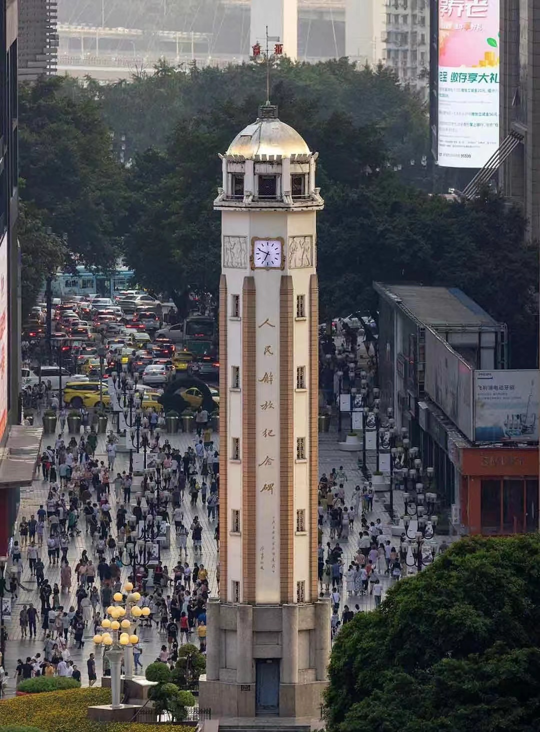 14:00游览解放碑(约1.5小时)解放碑,原名抗战胜利纪功碑,是全中国唯一的一座纪念中华民族抗日战争胜利的国家纪念碑,以纪念重庆对于国家的伟大贡献。位于重庆市渝中区,位于民权路、民族路和邹容路交汇处,它是抗战胜利和重庆解放的历史见证。碑体绝大部分呈白色,有些地方是肉色,上端有几架大钟,朝着四面八方,每到整点时,便会响起声音。塔是八角形的。"解放碑"是解放碑中央商务区(CBD)的代名词。有"西部第一街"美誉。有望跻身中国第三大商圈。