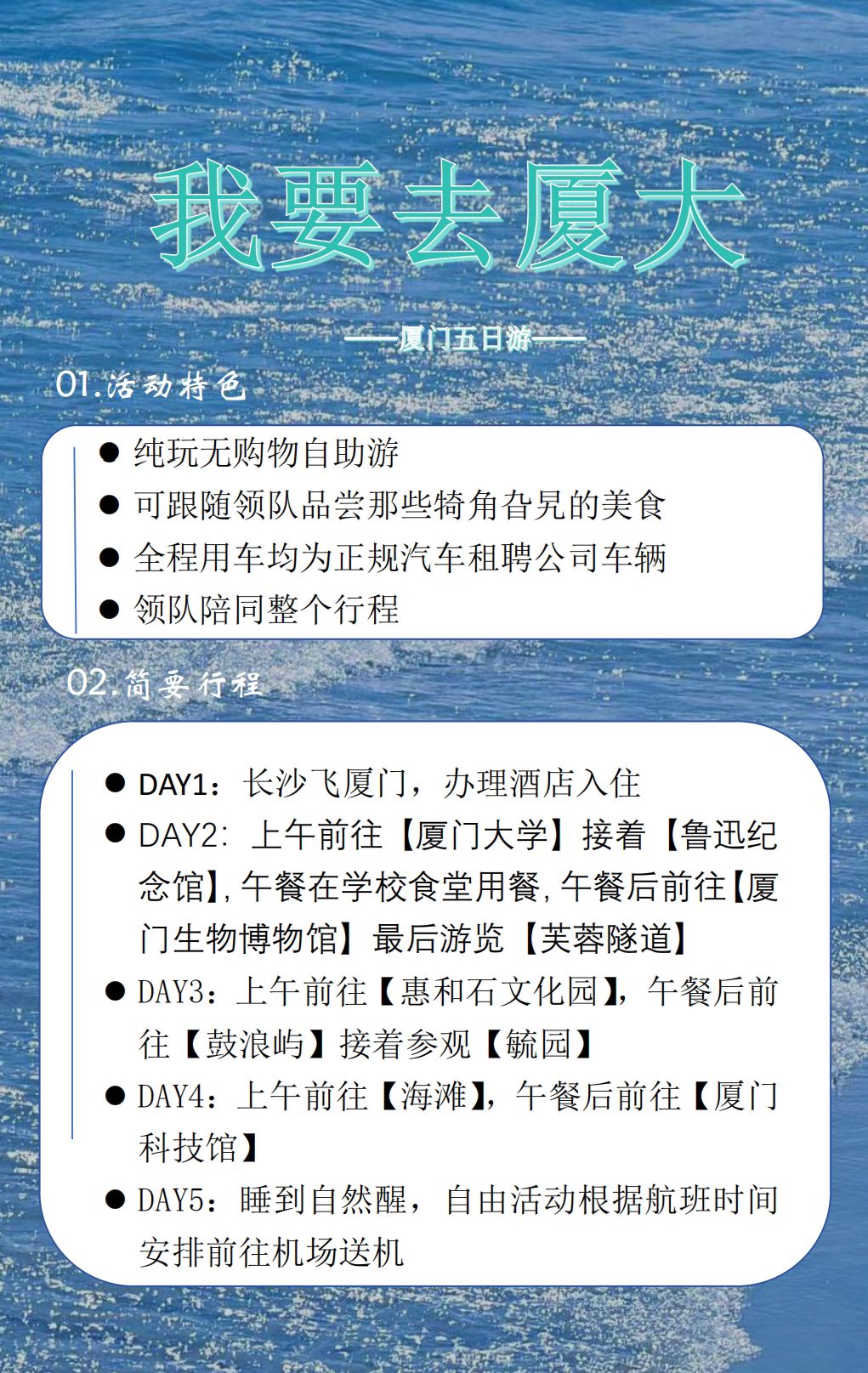 1、交通:长沙—厦门高铁二等座,当地空调旅游大巴;