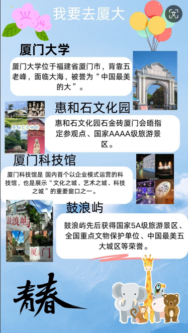 8:30 乘车前往【厦门大学】。【厦门大学校史馆】整个校史馆共有展板100多个,近千张照片、图表,配以凝练的文字,全面反映了厦大建校96周年来的办学历程和成就。展示内容分“南强春秋”、“英才摇篮”、“科研重镇”、“走向世界”、“展望未来”五个部分。