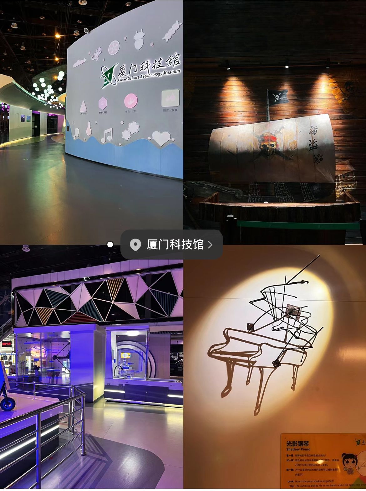 14:00 前往【厦门科技馆】。【厦门科技馆】走进【厦门科技馆】感受科技的力量,体验科技风暴,身临地震场景、勇闯海盗船。与智能机器人亲密互动,亲眼看见万伏高压放电过程。光影乐园美仑美奂,与光影来一场时尚有趣的互动;时空隧道如梦如幻,带你开启不同的星空体验;神奇电磁多才多艺,机器人各显神通,舞林大会上能歌善舞;在科技馆内,书本上的知识跃然于眼前,让理论于实际相碰撞。