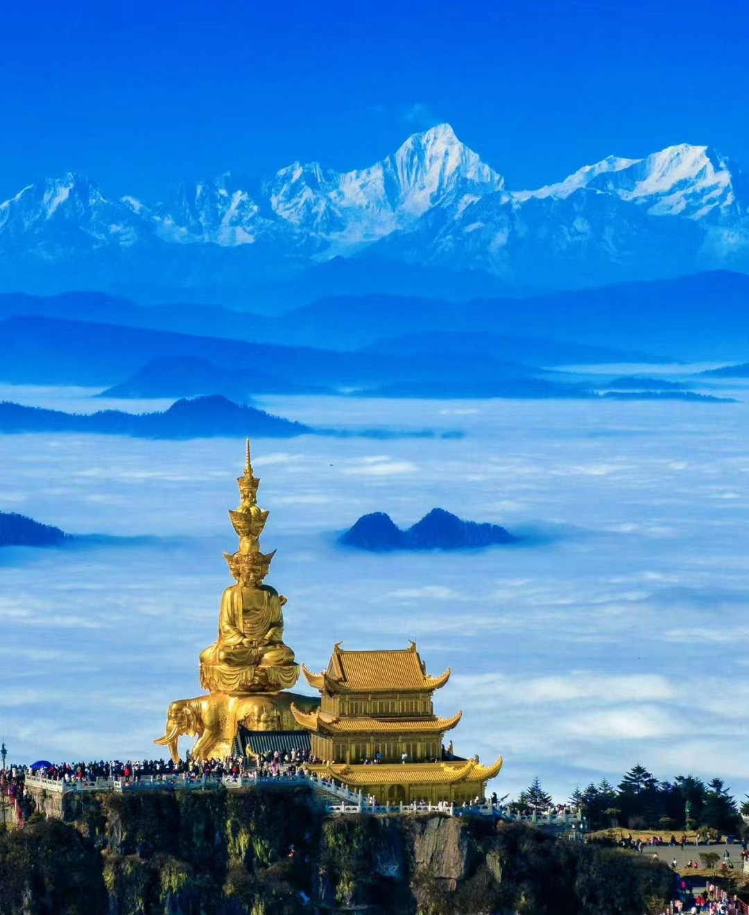 特色:峨眉山金顶作为峨眉山的最高峰,以其壮丽的自然风光和深厚的佛教文化底蕴著称。在这里,游客可以领略到云海的变幻、金顶寺庙的庄严肃穆,以及远眺四周群山的壮观景色。活动特色在于其宗教与自然的完美结合,为游客提供了一次心灵的洗礼和视觉的盛宴。