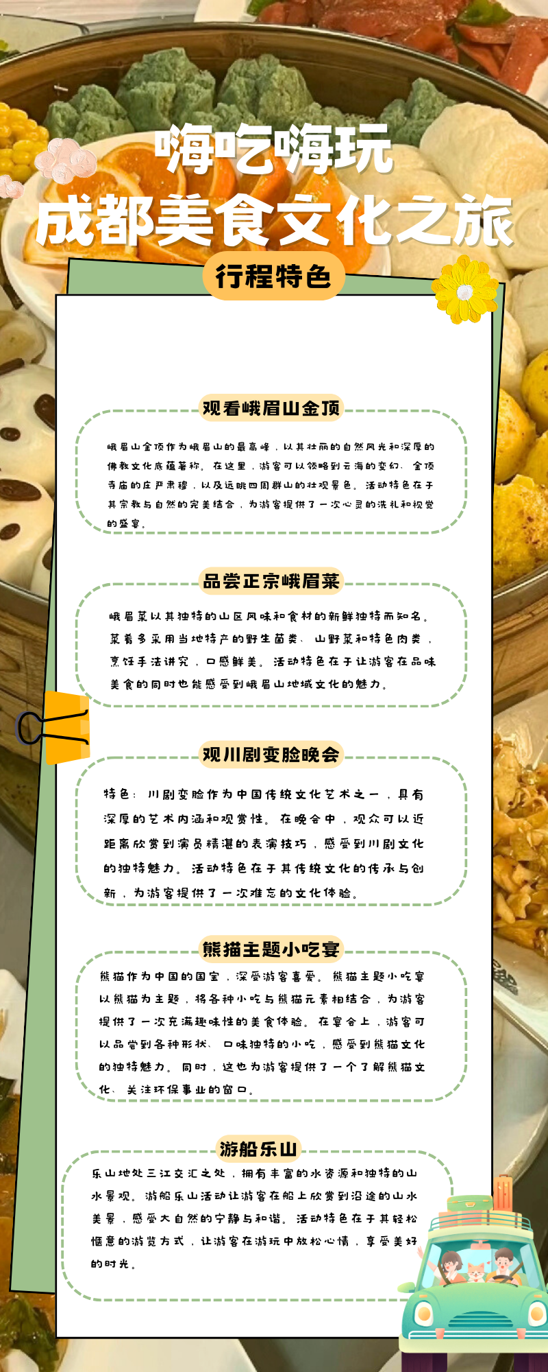 特色:熊猫作为中国的国宝,深受游客喜爱。熊猫主题小吃宴以熊猫为主题,将各种小吃与熊猫元素相结合,为游客提供了一次充满趣味性的美食体验。在宴会上,游客可以品尝到各种形状、口味独特的小吃,感受到熊猫文化的独特魅力。同时,这也为游客提供了一个了解熊猫文化、关注环保事业的窗口。