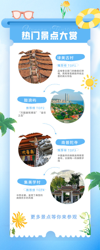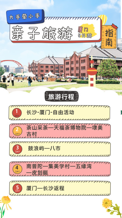 | 行程中所列景点: 天福茶博物馆+埭美古村,鼓浪屿+毓园+海天堂构+龙头路商业街+八市+中山路,南普陀寺+厦门大学芙蓉湖+集美学村+鳌园+五缘湾+环岛路 |