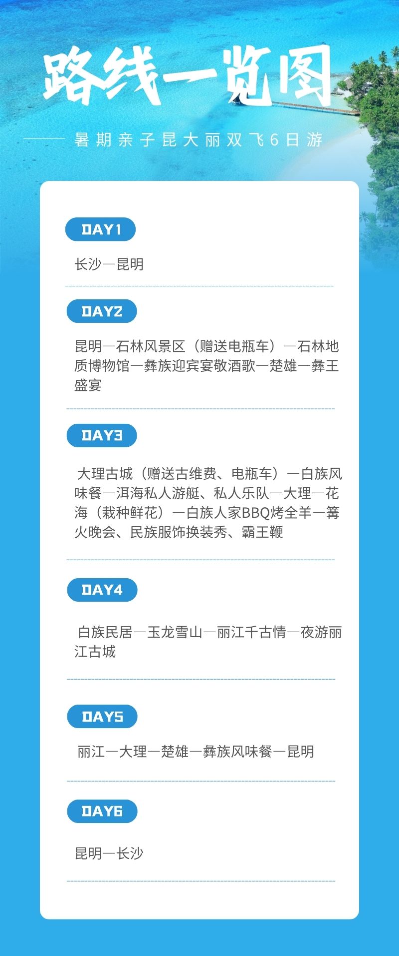 1、交通:长沙—昆明往返经济舱,含机场建设及燃油费;当地空调旅游大巴
