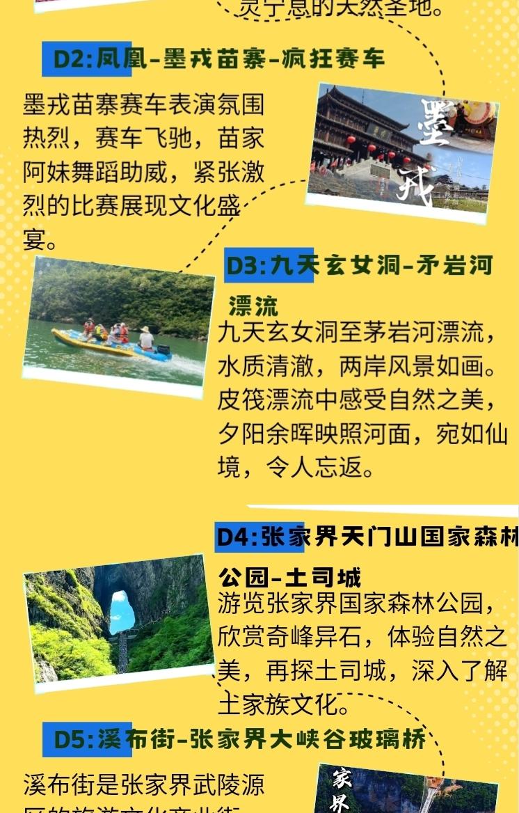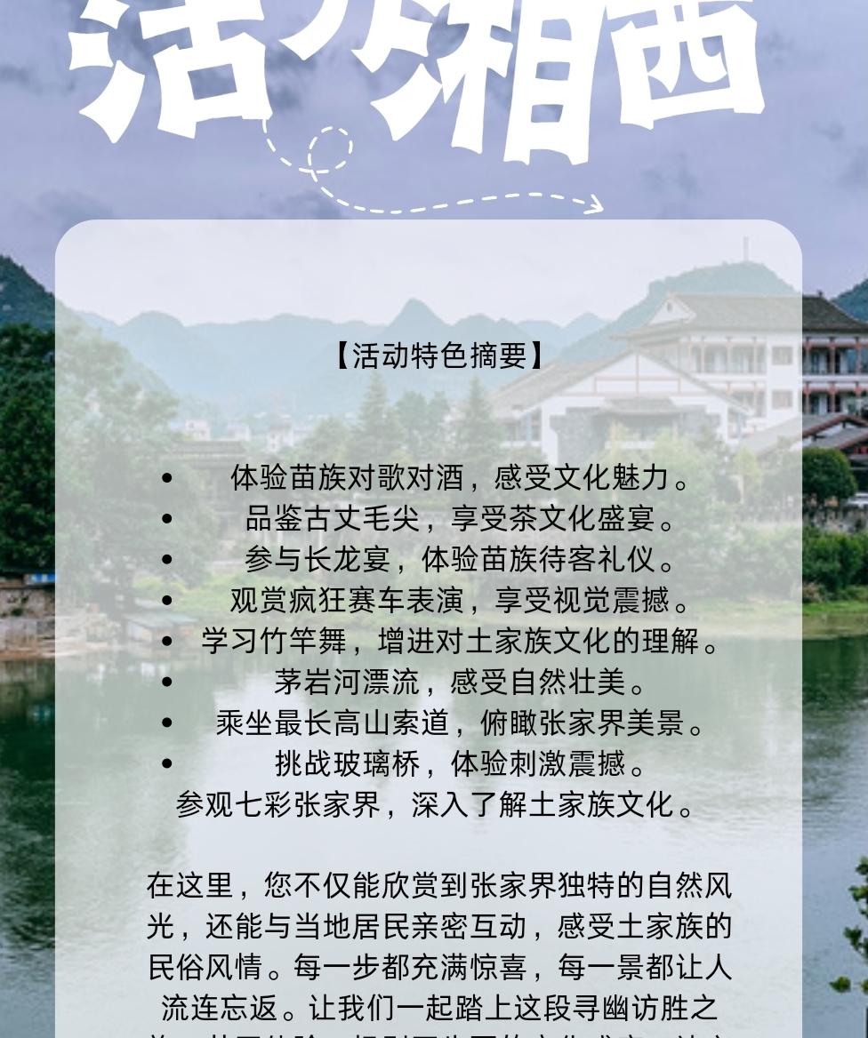 早餐后前往宋祖英的家乡、大湘西地区最大、最美丽、民俗风情最浓郁的国家AAA景区,被誉为“千里苗疆第一寨”——【墨戎苗寨】(门票已赠送)。对了歌、喝了酒、击完鼓,才能走进这个原始神秘的古苗寨,“竿子营”营房、烽火台流淌着历史的沧桑、苗族人的家国情怀、民族大义;去茶农家里品鉴最好的“有机茶”——“古丈毛尖”;打上了08奥运开幕式的墨戎“四方鼓舞”,会让您感受到战神蚩尤出征的震撼,秋实丰收的喜悦;精彩绝伦的各种苗族手工纺织、锻制技艺让人叹为观止;神秘的湘西巫术更会让您瞠目结舌、目瞪口呆……跳完竹竿摆手舞,就可以去体验苗家寨子里待客的最高礼遇——“长龙宴”了,那些热情的姑娘,一定要您对上苗家山歌之后,才会奉上筷子,和苗家阿妹一起载歌载舞,真正感受到苗族的人的真、善、美。下午乘车赴张家界,入住酒店。晚上看世界奇观【疯狂的赛车】(费用已含),世界级选手齐聚一堂为您上演真实版的【速度与激情】。