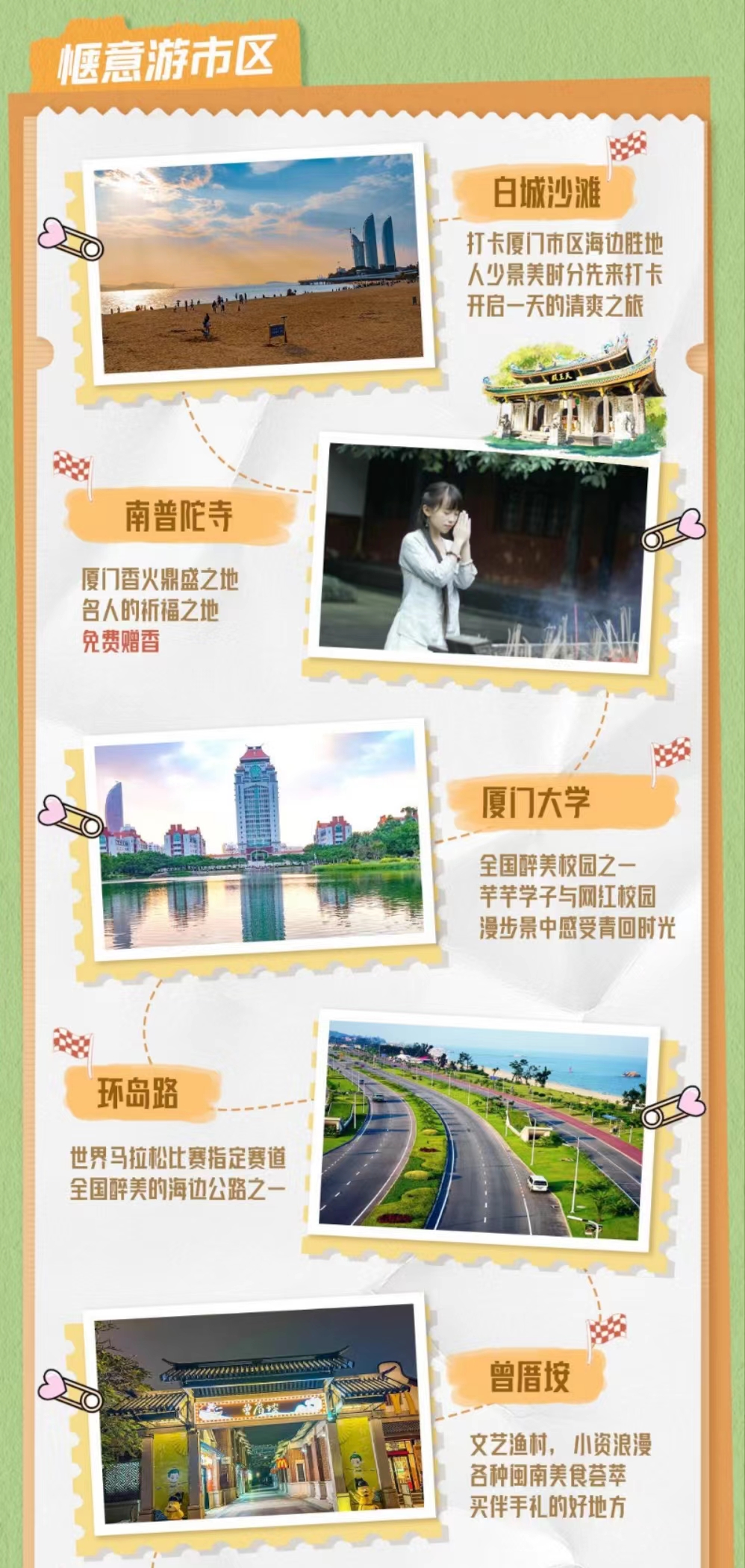 早餐后,前往千年古刹—【南普陀寺】(游览时间不少于30分钟),依山傍海毗邻闽南佛学院,拥有浓郁的佛教氛围。外观—【厦门大学】校园内标志性的芙蓉湖就象一颗璀璨的明珠,在初夏和暖阳光的照耀下,熠熠生辉,美不胜收。沿途而至厦大芙蓉隧道,位于厦大内部,芙蓉餐厅旁,有文艺隧道,有涂鸦隧道,是厦门大学主要景点之一,吸引着无数文艺青年及游客来此观光。下午乘轮渡前往【鼓浪屿】(游览时间不少于90分钟),感受鼓浪屿百年沧桑,沿途经过欣赏各国领事馆旧址、天主教堂。望别具风格“万国建筑博物馆”之称的鼓浪民居,探寻名人足迹。还可望日光岩、郑成功雕像。港仔后沙滩自由散步,土特产一条街自由购物。自由活动。