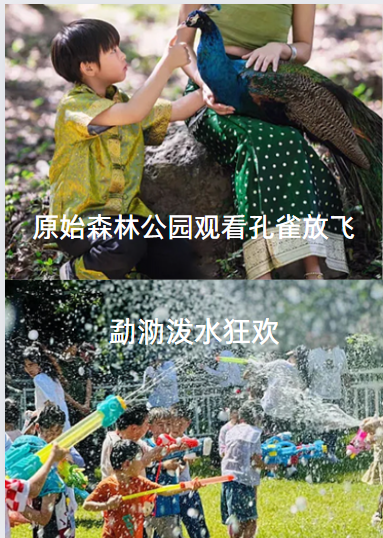 乘车前往游览国家AAAA级旅游景区、《奔跑吧兄弟第四季》拍摄地——原始森林公园。观看野生动物表演,孔雀放飞;欣赏西双版纳多民族乐器展演,民族歌舞表演;漫步热带沟谷雨林,感受神秘的原始森林气氛;如果您善于探险,勇于挑战,还可自费参加景区内最刺激,最具有挑战性的户外冒险活动——“丛林飞跃”,体验不一样的精彩。