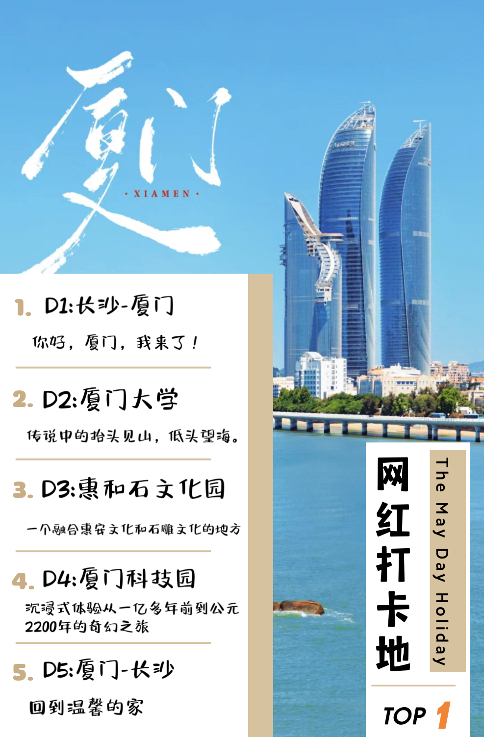1、交通:长沙—厦门高铁二等座,当地空调旅游大巴;