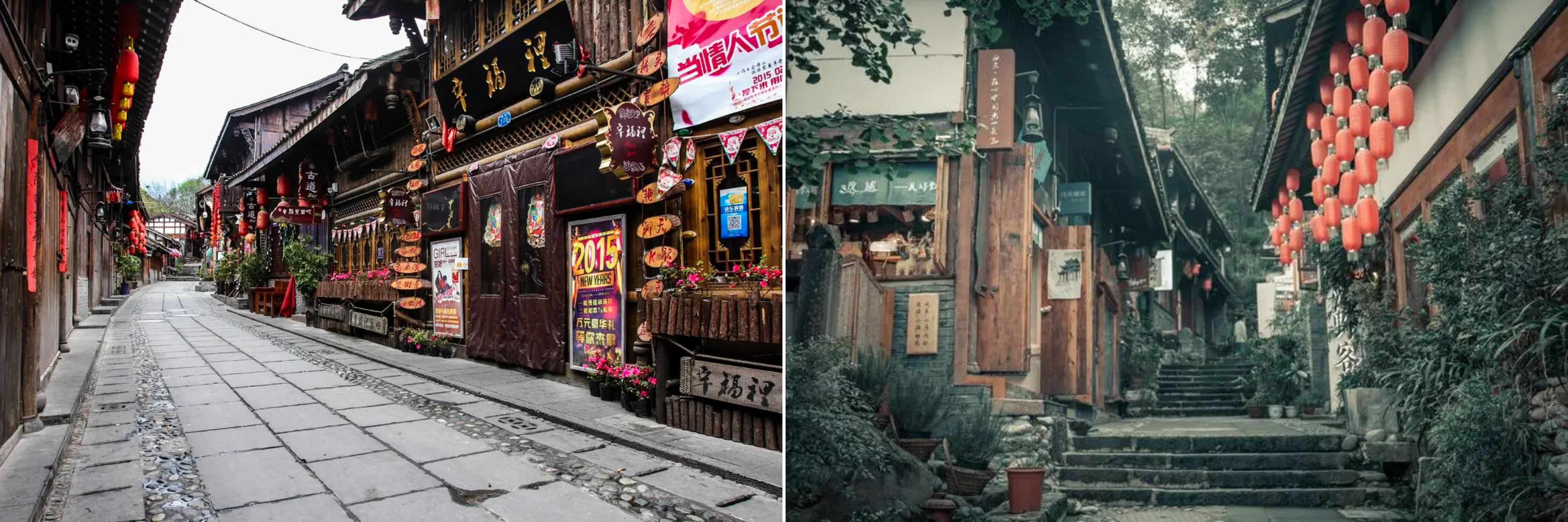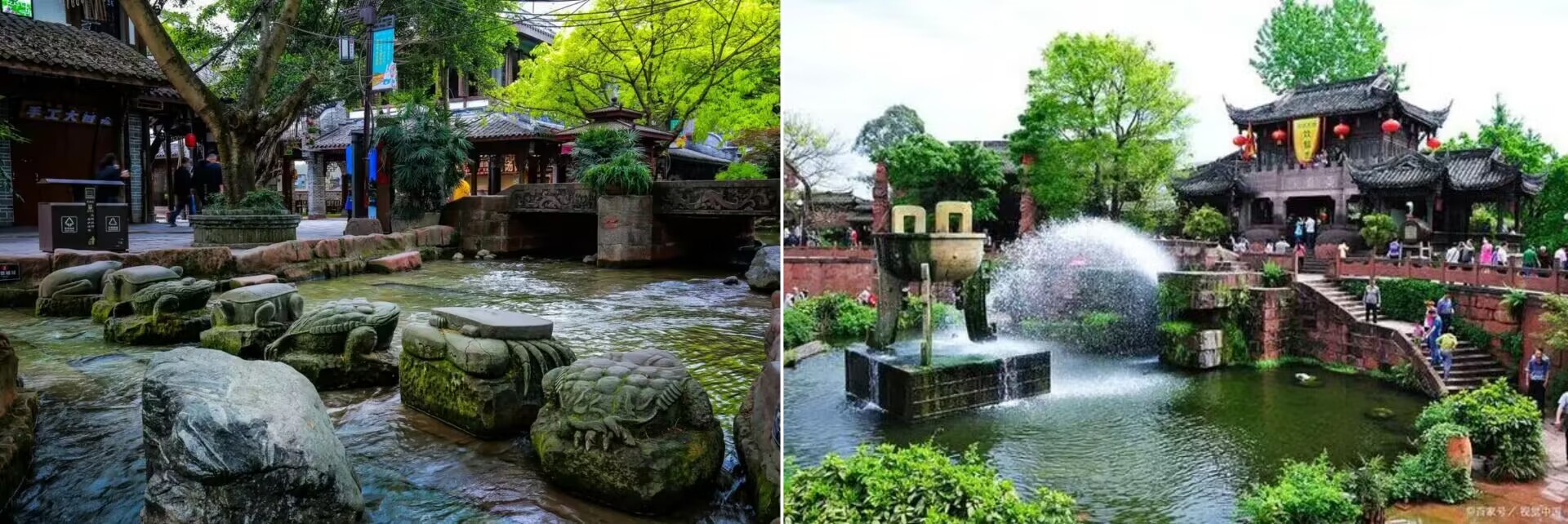 黄龙溪古镇是中国的“好莱坞“,天府第一名镇。古镇中贯穿古街的溪流穿街而下,时而湍急,时而舒缓,炎炎夏日里的戏水区更是消暑好去处,耍水的人们赤膊上阵,与水龙共舞,激情上演极具川西特色的“泼水节”。