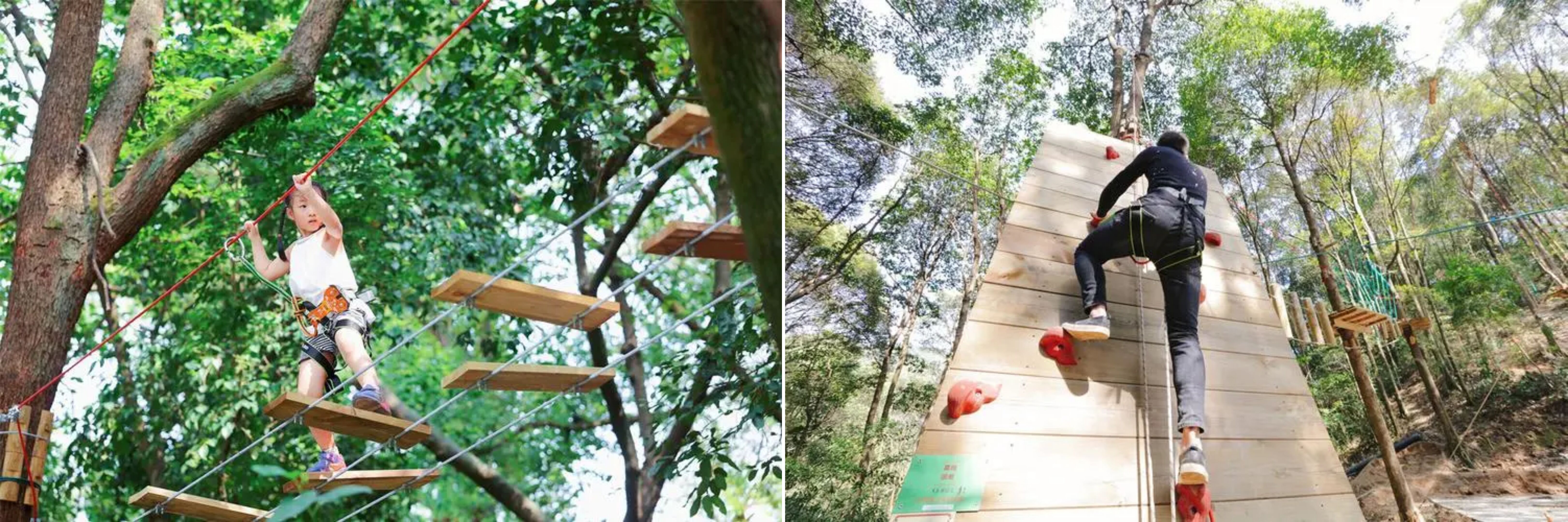 飞越丛林 通过树木将各种各样的障碍环节将连成一条线路,需要通过悬空桥梁、网道、步道、木桶、泰山秋千、飞狐索道和其他趣味环节等方式进行树木间的探险。 通过爬、滑、游、跨、跳、飞等动作越过所有障碍,到达终点。在整个运动中,汇集了高空、速度、力量、毅力等户外探险所必备的元素,为参与者提供了感官上的刺激。