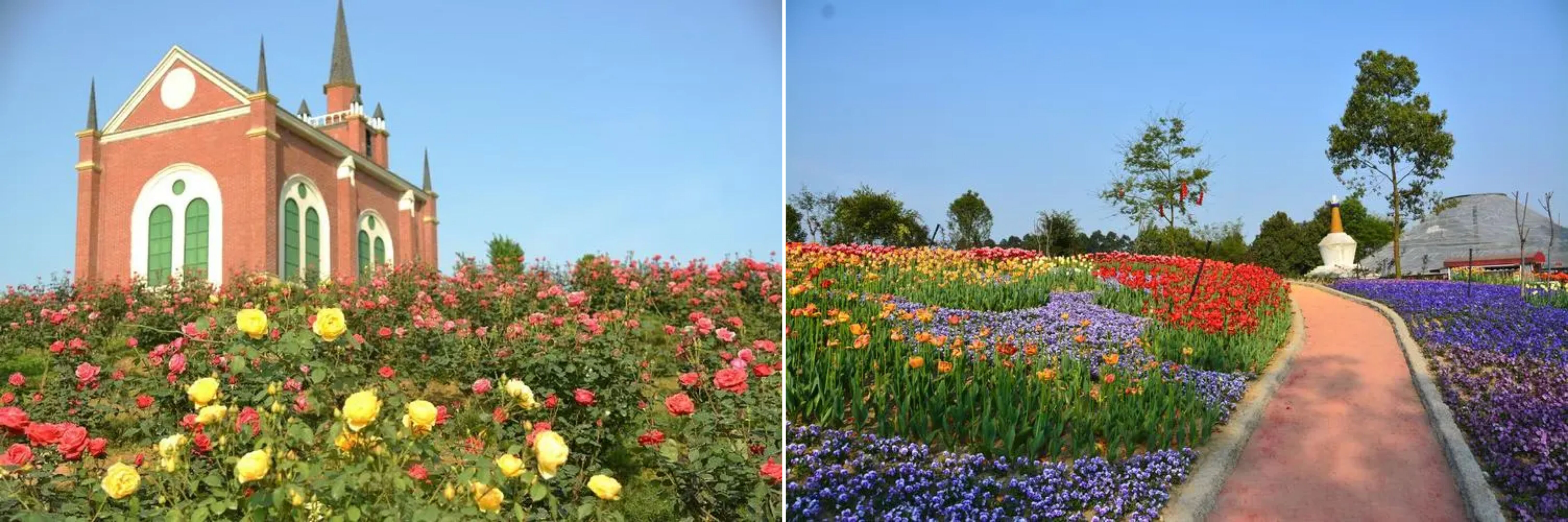 玫瑰花溪谷 花田景观占地400亩,大片种植丰花月季玫瑰,让您徜徉花海,观花看海,留意花丛,花柱造型,以藤本月季为主,制作造型奇特的花卉景观。写意梅林,绽放时候,写意梅林占地200亩,主要以红梅古树为种植树木,寒冬时节,满山的似火的山坡,惬意不已。五彩水池,流淌美丽,流淌的溪水,五彩的树叶与花卉,点缀着70余亩的灵动,跳动生命的乐章。破土成林,竹林通幽,山谷竹海占地400余亩,曲径通幽,根根竹笋破土而出,造就一方幽静。