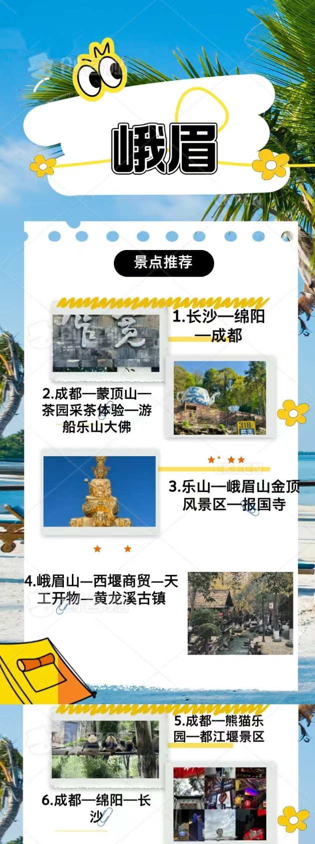 7:00 酒店豪华自助早餐,出发前往眉山参观西堰商贸(约2小时) 【西堰商贸】:鉴赏翡翠之美、结缘天下之情,翡翠的颜色自然而又富于变化,鲜艳悦目。在这里你可以结缘一段东方人的翡翠之恋,赠送亲朋好友。后享用自助午餐。午餐后参观4A级景区天工开物(游览约1.5小时)【天工开物】:4A级景区,水晶珍品博物馆、水晶佛文化陈列馆、以及水晶精品展销区——展馆以远古佛教故事为载体,采用水晶宝石语言诠释和演绎水晶文化,馆内独特的场景,无论是地球之心的建筑轮廓,佛祖修炼的洞穴,佛陀顿悟的菩提树,五彩的星座神话,华丽璀璨的弥勒世界,全部采用稀有的水晶宝石,并充分运用创新的陈列技术,将环幕投影、幻影成像、水幕投影、全息成像、虚拟现实等高科技技术将现代科技运用到物理场景里面,通过声、光、电、多媒体手段为国内外游客展示乐山、峨眉山博大精深的佛教文化,同时为观者诠释魂牵梦绕的水晶魔力,带给游客崭新的视觉之旅。随后,前往黄龙溪千年古镇游览(约1小时)【黄龙溪古镇】:黄龙溪建镇已2100多年,历史底蕴深厚,古名“赤水”。又名永兴场。黄龙溪的核心景区是以古镇为中心的5平方公里的地区,她以古街、古树、古庙、古堤、古埝、古民居、古码头、古战场、古崖墓和古衙门的“十古”著称。自由享用晚餐后返回酒店休息。