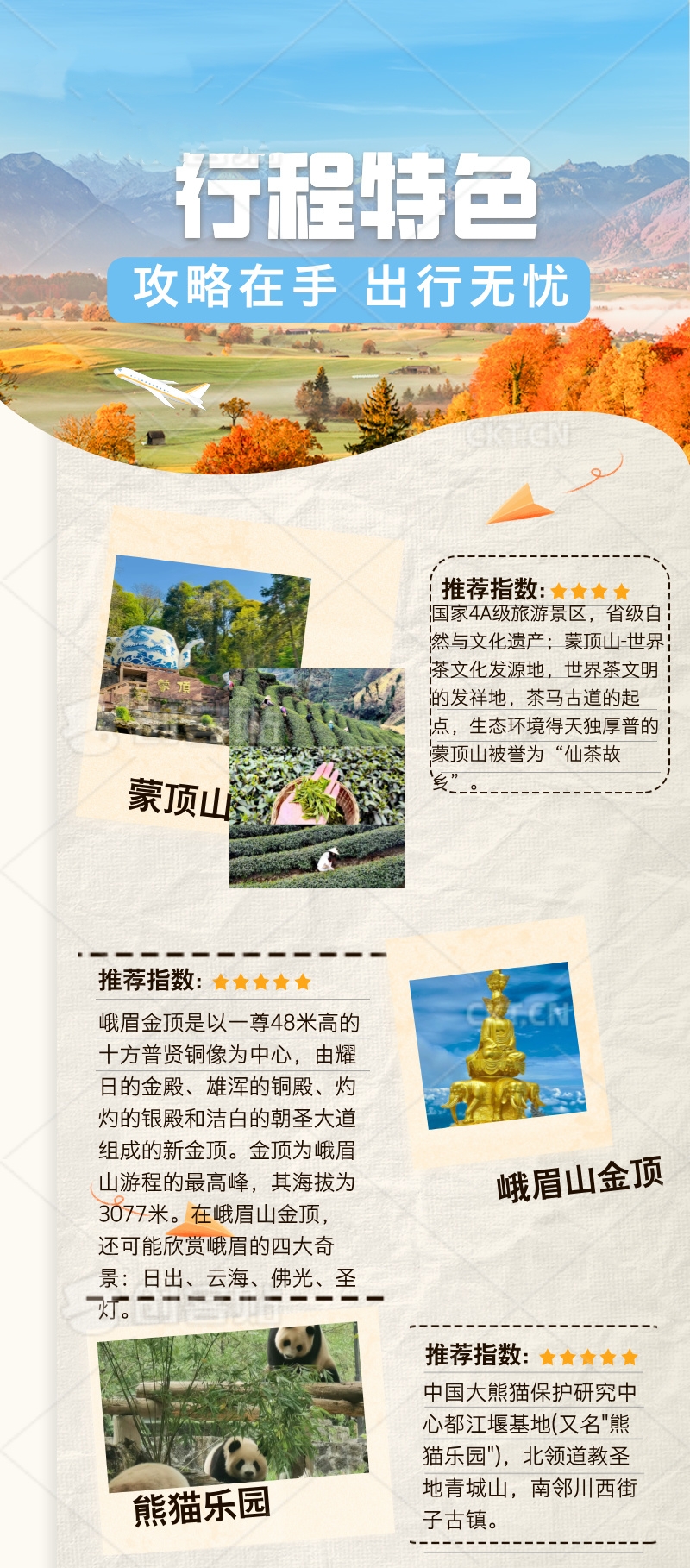 7:00 酒店享用自助早餐后,出发前往峨眉山报国寺(游览50分钟)【峨眉山-报国寺】:峨眉山的第一座寺庙、峨眉山佛教协会所在地,是峨眉山佛教活动的中心。峨眉山的众多寺庙里,报国寺是入山的门户,是游峨眉山的起点。这里寺周楠树蔽空,红墙围绕,伟殿崇宏,金碧生辉,香烟袅袅,磬声频传。后出发游览峨眉山金顶游览(约2小时)【峨眉山-金顶】:乘坐观光车(观光车费用90元/人自理)至雷洞坪,徒步1.5 公里约 40 分钟至接引殿,途经雷洞坪猴区,可以戏峨眉山野生猴群。午餐后乘坐金顶往返索道(费用自理,往返120元/人)上金顶。峨眉金顶是以一尊48米高的十方普贤铜像为中心,由耀日的金殿、雄浑的铜殿、灼灼的银殿和洁白的朝圣大道组成的新金顶。金顶为峨眉山游程的最高峰,其海拔为3077米。在峨眉山金顶,还可能欣赏峨眉的四大奇景:日出、云海、佛光、圣灯。约18:00 在峨眉山市区社会餐厅【峨眉印象】用晚餐晚餐后入住超五星园林温泉酒店【蓝光己庄酒店】——在环境优美中体验来自地下3000米富含多种元素和矿物质的天然温泉。