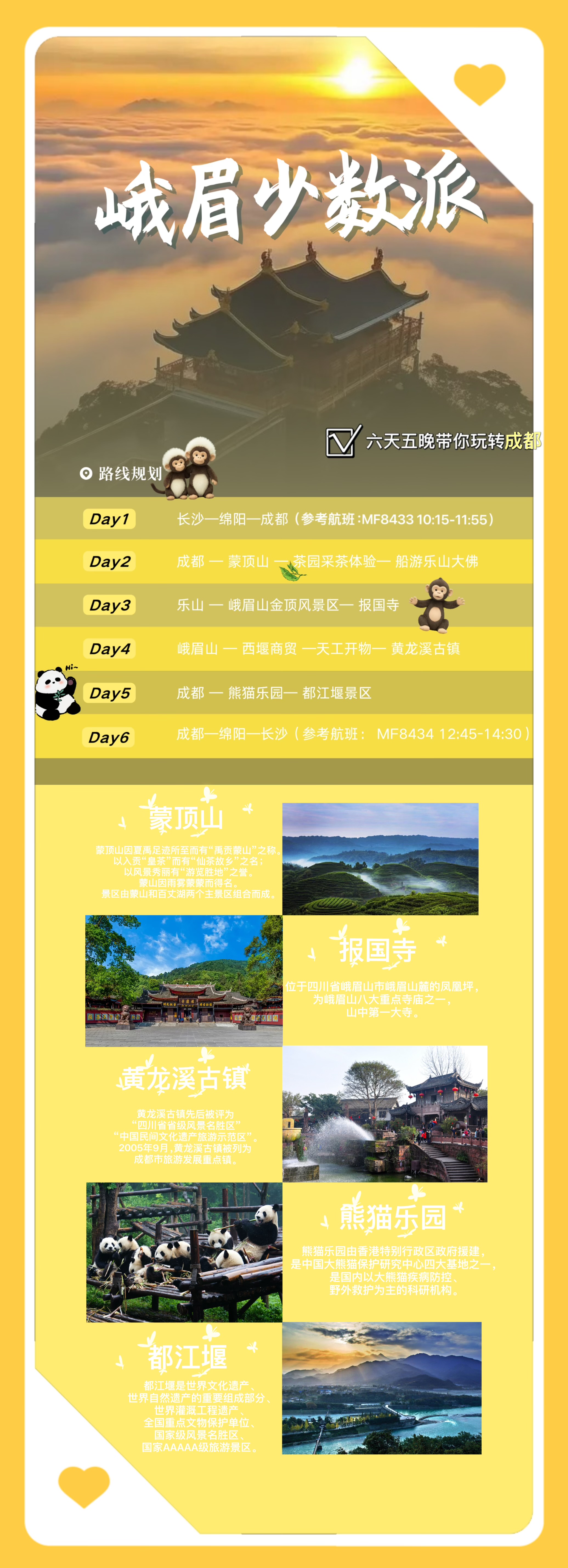 前往蒙顶山采茶、观赏熊猫乐园、船游乐山大佛、报国寺、峨眉山、都江堰