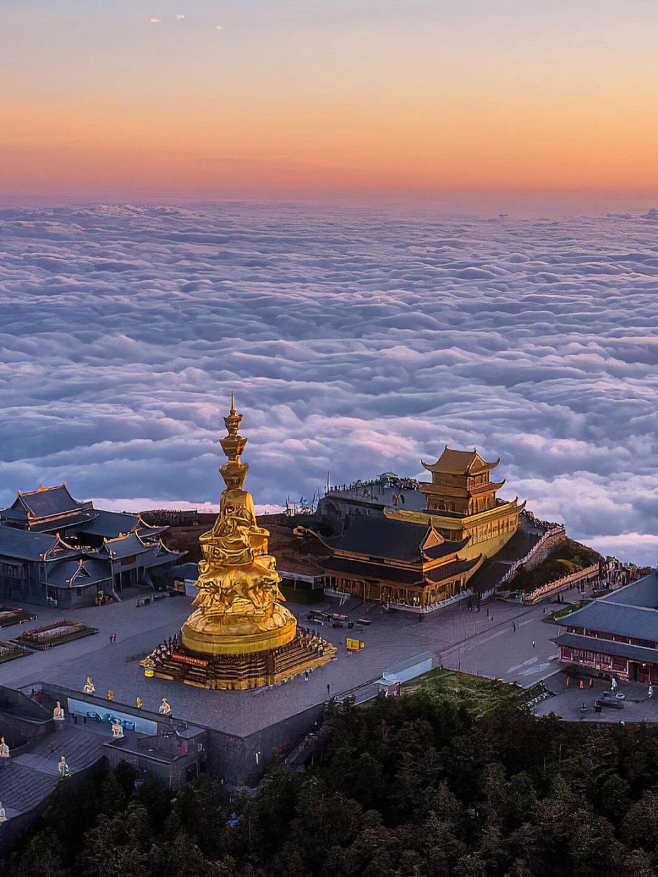 午餐后乘坐金顶往返索道(费用自理,往返120元/人)上金顶。峨眉金顶是以一尊48米高的十方普贤铜像为中心,由耀日的金殿、雄浑的铜殿、灼灼的银殿和洁白的朝圣大道组成的新金顶。金顶为峨眉山游程的最高峰,其海拔为3077米。在峨眉山金顶,还可能欣赏峨眉的四大奇景:日出、云海、佛光、圣灯。