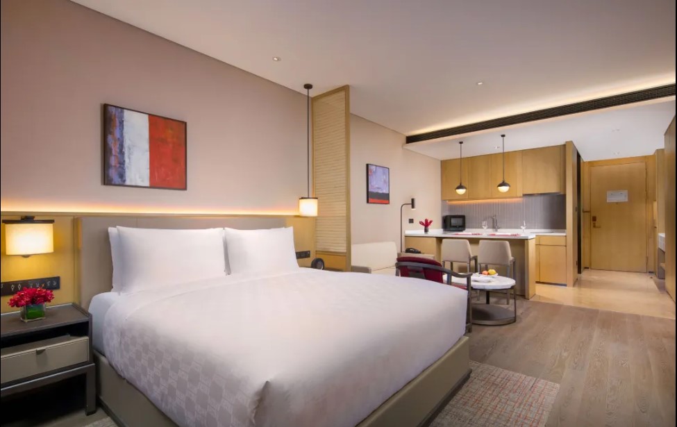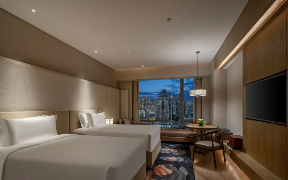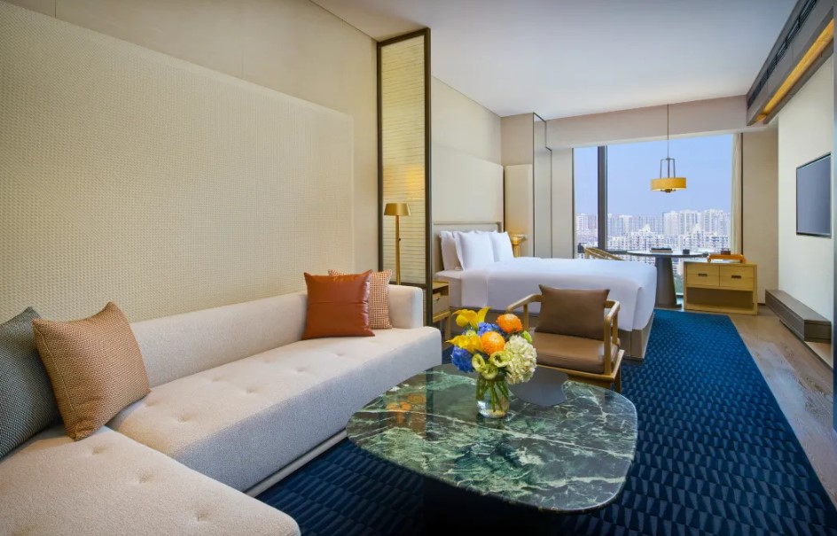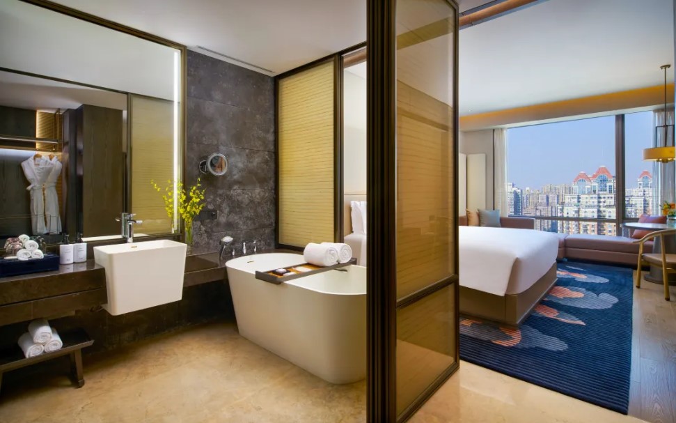 套房面积从45至180平方米不等,所有客房均设有办公区,套房另设有独立的起居区及会客区。整体设计优雅现代,全景落地窗带来开阔视野,城市繁华之景尽收眼底。皮革材质的墙面由匠人全手工编织,一经一纬再现中华传统技艺,细节触感尽显奢华。