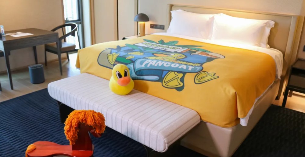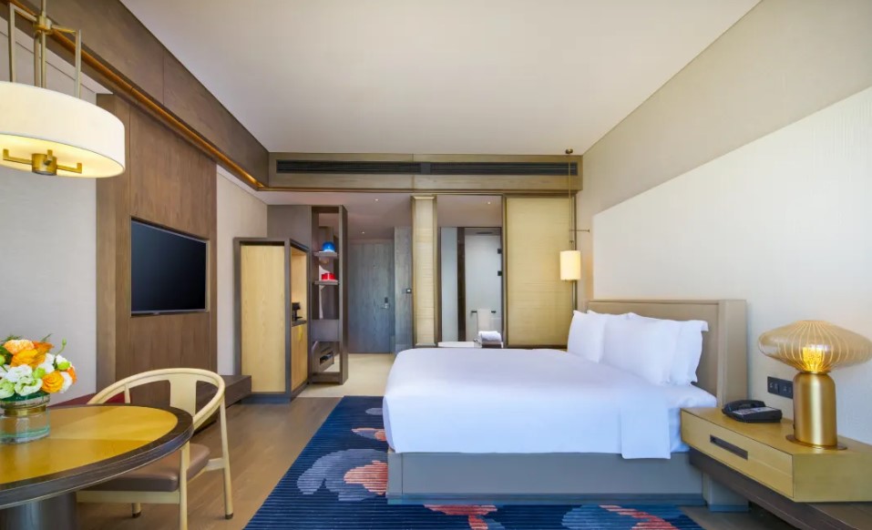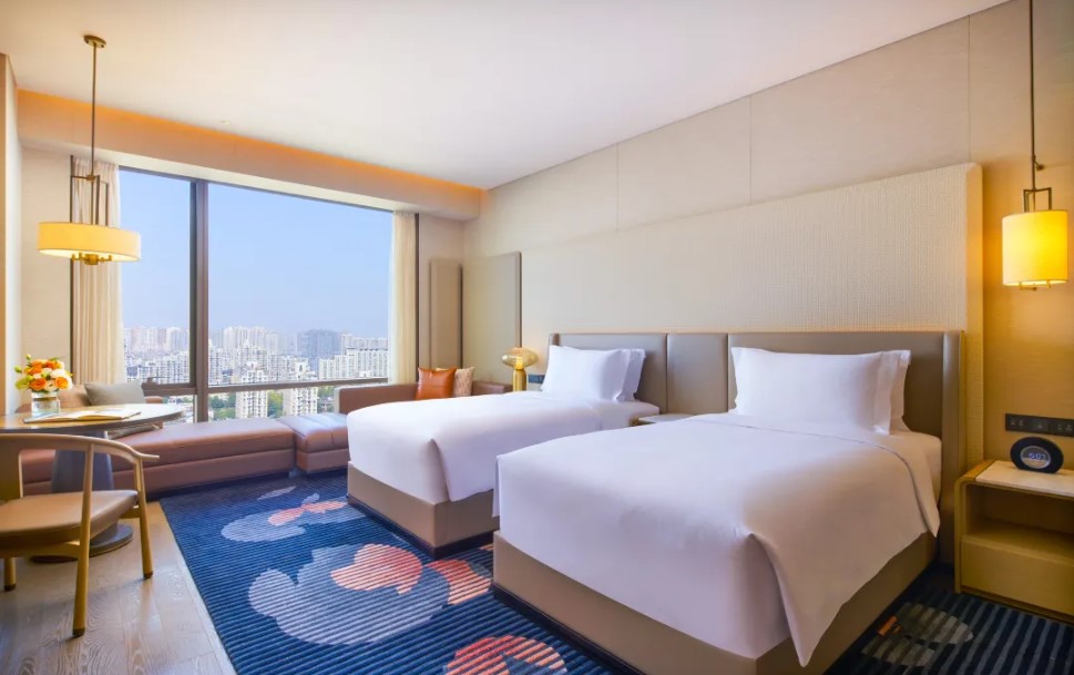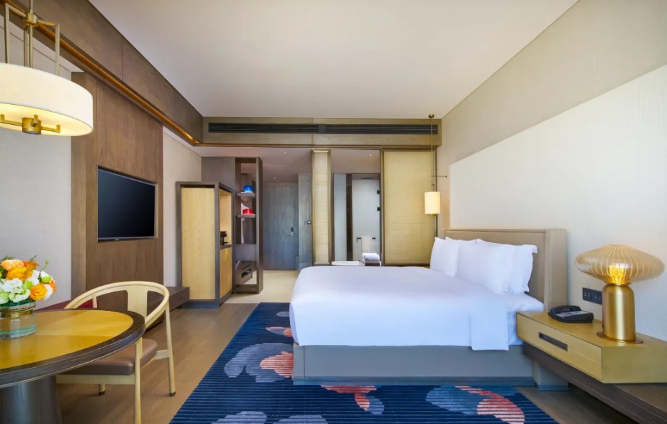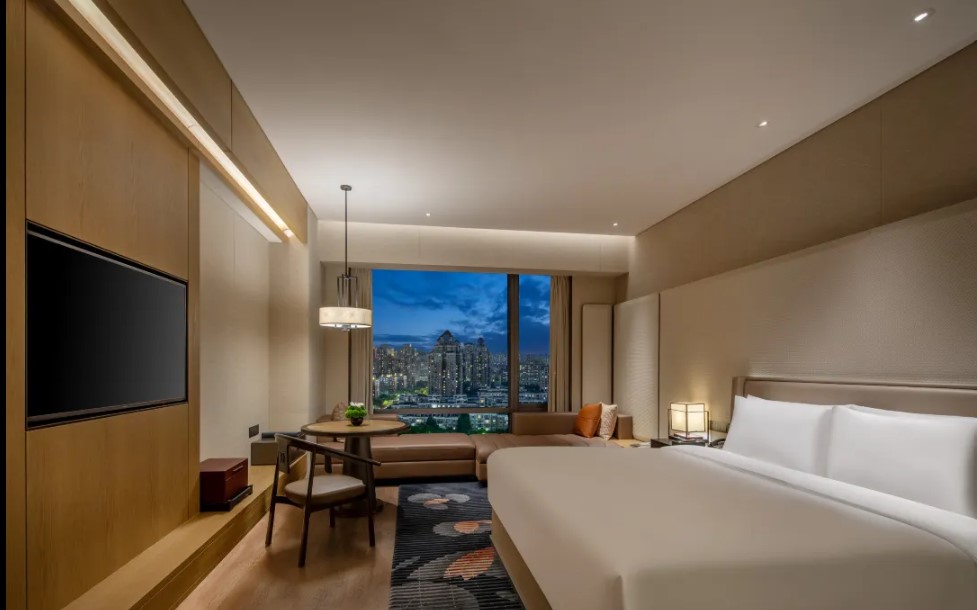 酒店建筑设计以“东方园林,唐风意蕴”为灵感,融汇中西现代美学,中式园林 “坐北朝南”和中轴对称布局,构筑出隐于闹市中的园林私邸谧境。顺沿着茂密松竹林道进入酒店,大堂天花板梁斗拱、柱廊和门扇再现古都大宅的气派与精美,营造出城市桃花源般的宅度假空间氛围。