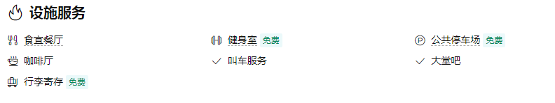 储物柜 会议厅 走廊扶手 停车场 咖啡厅 叫车服务 图书馆 儿童浴袍 租车服务 儿童拖鞋 洗衣房 行李寄存 代客泊车 无障碍客房 无障碍通道 祈顺中餐厅 1897音乐吧餐 西餐厅 送餐服务 中餐厅 专车接机 儿童托管 代替泊车 私人停车场 叫车服务 公共停车场 干衣机 叫车服务 送站服务 儿童乐园 大堂吧 婴儿推车 接站服务 多功能厅 火灾报警器 门禁系统 灭火器 安保人员 烟雾报警器 公共区域监控 公用区wifi 电梯 新风系统 吸烟区 公共音响系统 无烟楼层 叫醒服务 干洗服务 洗衣服务0条点评 100%满意景洪告庄西双景景亮寨7栋¥133起