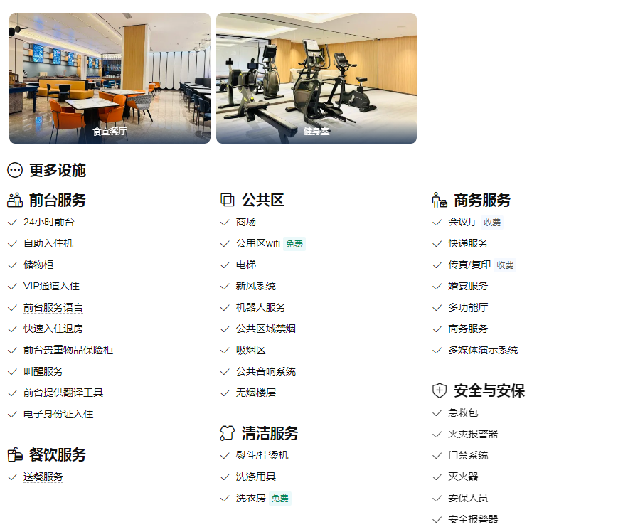 公共区域监控 咖啡厅 会议厅 走廊扶手 停车场 礼品廊 叫醒服务 行李寄存 无障碍客房 无障碍通道 提供轮椅 吸烟区 专车接机 盲文标题 净水器 急救包 商务服务 礼宾服务 一氧化碳报警器 电子身份证入住 安全报警器 净水级 叫车服务 公共停车场 礼宾服务 儿童餐 门禁系统 接机服务 送机服务 加湿器 儿童乐园 会议厅 商务中心 快递服务 传真/复印 婚宴服务 多功能厅 送站服务 火灾报警器 安保人员 烟雾报警器 公共区域监控 公用区wifi 电梯 新风系统 公共音响系统 行政酒廊 无烟楼层 提供轮椅 行政酒廊 公共区域禁烟0条点评 100%满意湖南省株洲市沿江道电询 -