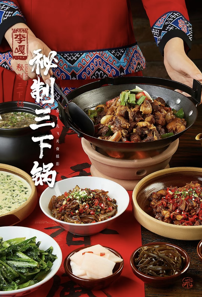 中餐升级为特色风味餐“三下锅”,张家界头牌菜,2009年荣登湖南14市州故乡菜之首。传明代嘉靖年间,朝廷征调湘鄂西土司兵上前线抗倭,恰好赶上年关,为不误军机,土司王下令提前—天过年,于是腊肉、豆腐、萝卜一锅煮,叫吃“合菜”,逐演变成“三下锅”。
