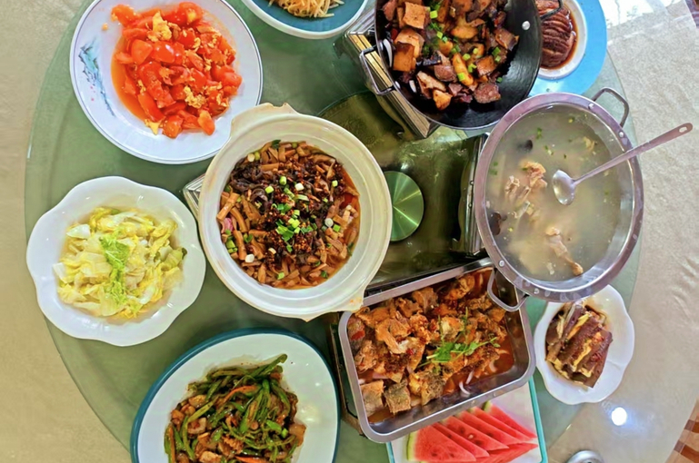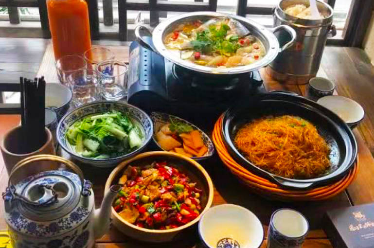 抵达后前往农门寨品尝特色午餐,中餐升级为特色风味餐“三下锅”,张家界头牌菜,2009年荣登湖南14市州故乡菜之首。传明代嘉靖年间,朝廷征调湘鄂西土司兵上前线抗倭,恰好赶上年关,为不误军机,土司王下令提前—天过年,于是腊肉、豆腐、萝卜一锅煮,叫吃“合菜”,逐演变成“三下锅”。