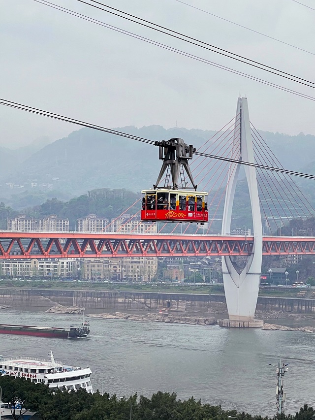 10:40乘坐【长江索道】,已经成为了游客在山城的必游项目。索道起于渝中区长安寺(新华路),横跨长江至南岸区的上新街(龙门浩)。乘上索道,滑向江对岸,一路可见近在咫尺的钢筋森林、长江以及江北南岸区的风光。长江索道也成为众多影视剧在重庆取景的必选地,代表作有:2001年《周渔的火车》、2006年《疯狂的石头》、2006年《好奇害死猫》、2007年《门》等影片,以及综艺节目《极限挑战》等。