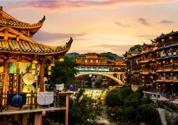 坐上农家小船欣赏凤凰古城沱江下游的风光。凤凰古城农家船景区可用“一江、两岸、三品、四桥”来表述。“一江”,既凤凰沱江母亲河。“两岸”,既凤凰沱江边的接官道和柳林游道。“三品”,既景区的三个旅游产品:休闲景观游,竞技体验游,夜景怡情游。“四桥”,凤凰景区内的四座桥:情人桥启航、雾桥发呆、廊桥遗梦、红桥怀旧。