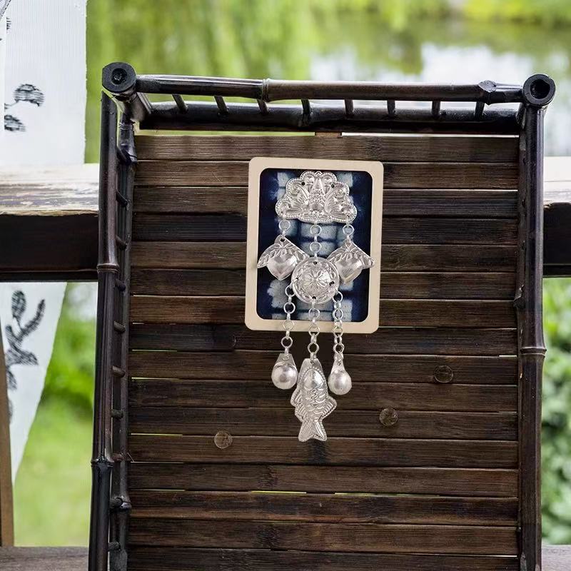 • 工艺与造型:基底采用手工扎染布料,蓝白晕染如洱海涟漪自然灵动;苗银圆牌錾刻传统花纹,下方垂挂錾花小鱼与银质坠饰,每一处细节都凝聚着非遗匠人的手工温度。
