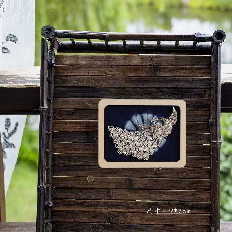 • 工艺与造型:基底采用手工扎染布,蓝白晕染如傣家月色下的湖面,自然又富有层次;苗银打造的孔雀轮廓精致立体,羽翼錾刻细密花纹,尾羽微微舒展,部分款式缀有银质流苏,轻晃间似孔雀起舞,每一处细节都藏着匠人手工的温度。