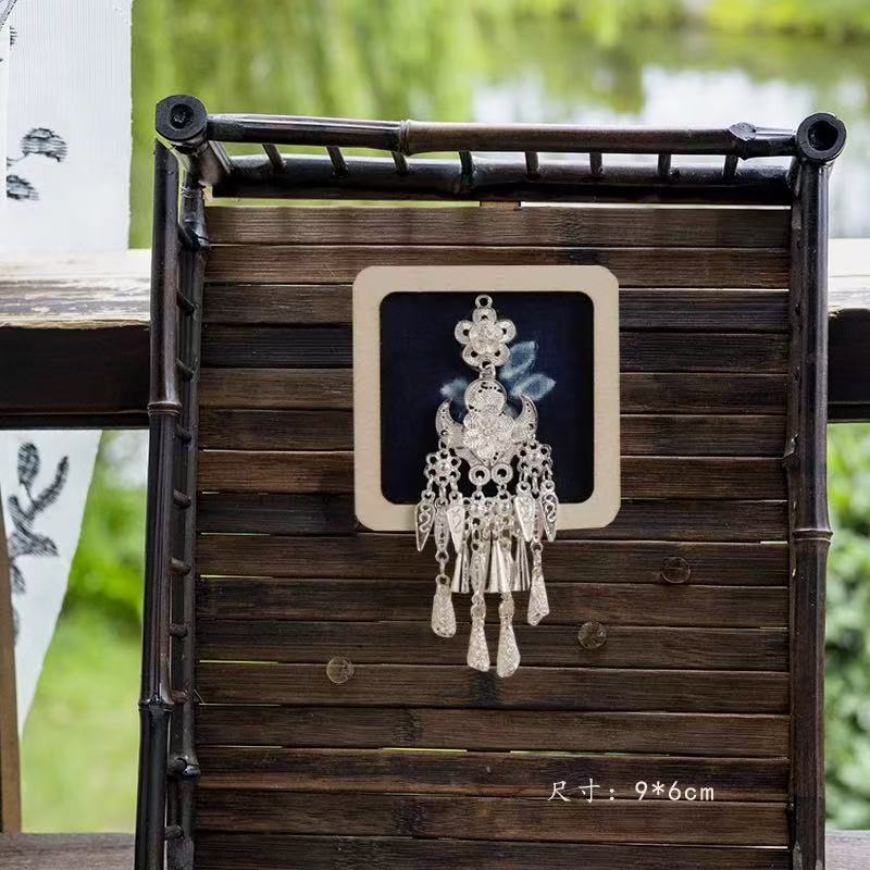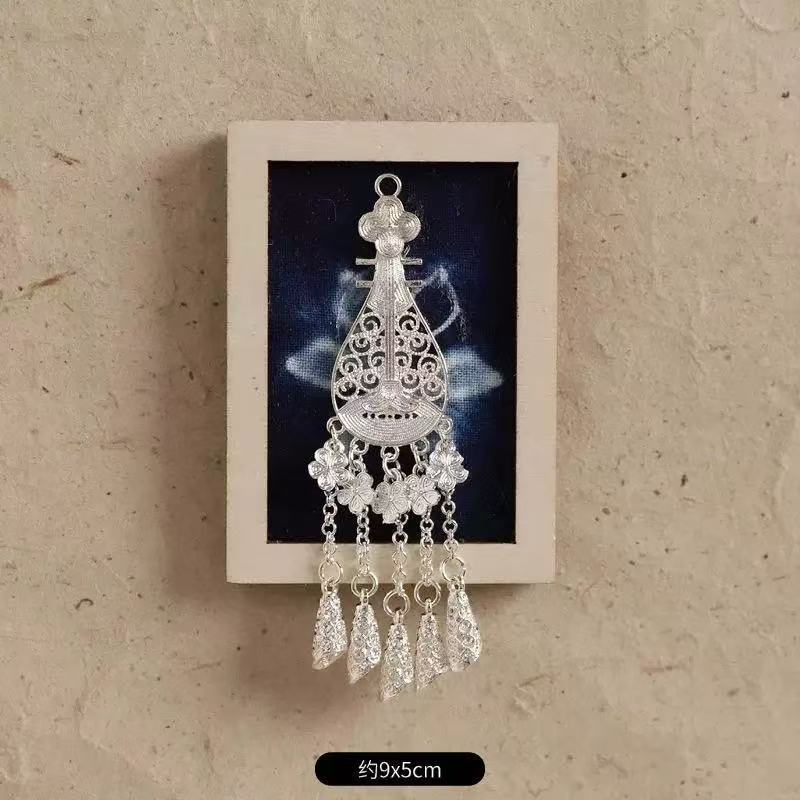 • 工艺与造型:主体以苗银花丝工艺打造琵琶轮廓,银丝细腻盘绕,琴身錾刻缠枝纹、云纹等传统纹样,细节处尽显花丝工艺的精巧;搭配手工扎染布料为基底,蓝白晕染如古画留白,与银质琵琶形成质感对比,部分款式还在琴尾缀以小巧银铃,灵动又别致。