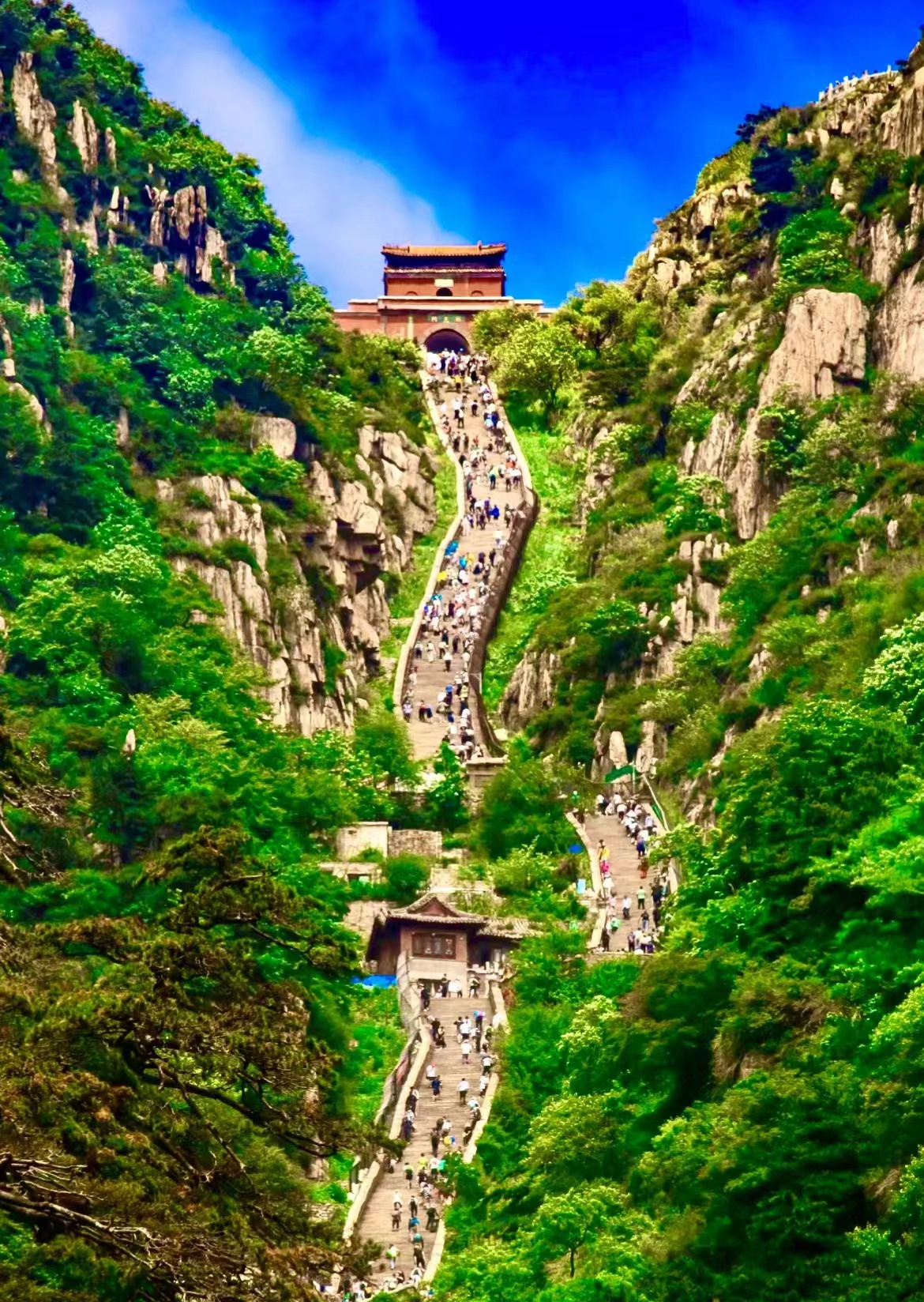 这是泰山上最著名的一段山路,以其陡峭的台阶和蜿蜒的路线挑战着登山者的体力和毅力。