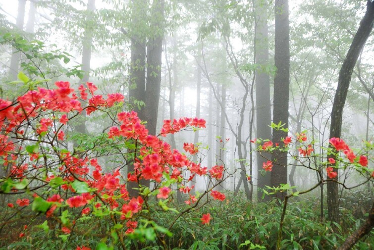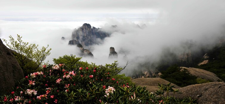 人间四月芳菲尽,黄山春花始盛开。黄山四月份开始进入春季,所有的生灵经历了一冬的休养生息,开始萌动,开始舒展,开始从冬的深厚走向春的灵秀。从天都峰鸟瞰,黄山的春色从一座座雄伟的奇峰、一棵棵苍劲的古松、一片片青翠欲滴花草中舒展、延绵。春游黄山,总少不了去看看灿若朝霞的杜鹃花。“五月黄山杜鹃红”,5月,山脚下已芳菲殆尽,而黄山仍是一派浓浓春意。一株株色彩缤纷的黄山杜鹃花俏然盛开,成片分布,形成花海,或大红,或粉红,在青翠的群山之中显得格外娇媚。近距离欣赏黄山杜鹃花,更觉绮丽多姿。阵阵春风吹过,花香扑鼻,令人陶醉。而更让人心生欣喜的是,黄山短尾猴嬉戏在山谷里,杜鹃花丛中,溪涧旁,凭添了无穷的乐趣。除杜鹃花外,黄山还可看到一种玉洁冰清的花中罕物,那就是花色纯白,花蕊嫩黄的天女花。在散花坞中,在清凉台旁,都可看到其隐迹幽谷、超凡脱俗的芳姿。当杜鹃、天女花,花时将过,落英缤纷时,映山红又及时地绽放,一簇簇、一丛丛,把黄山春的景致丰满了,延长了。
