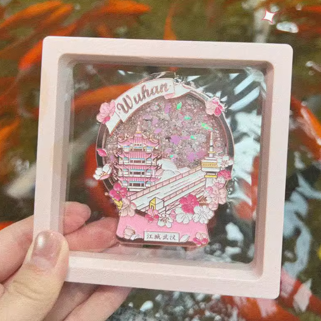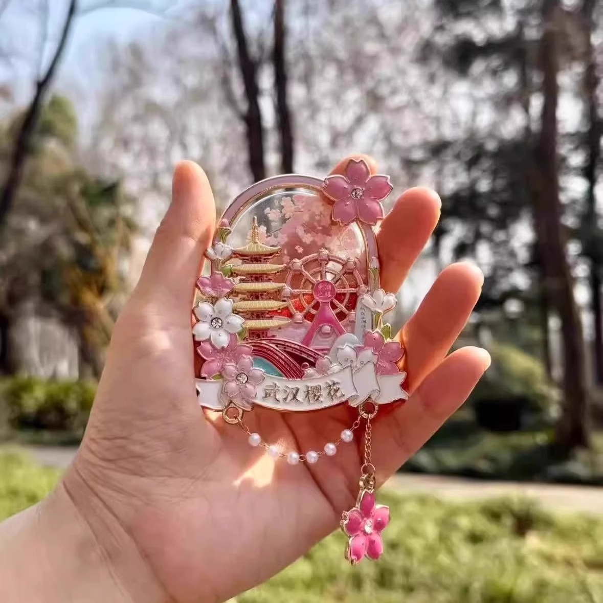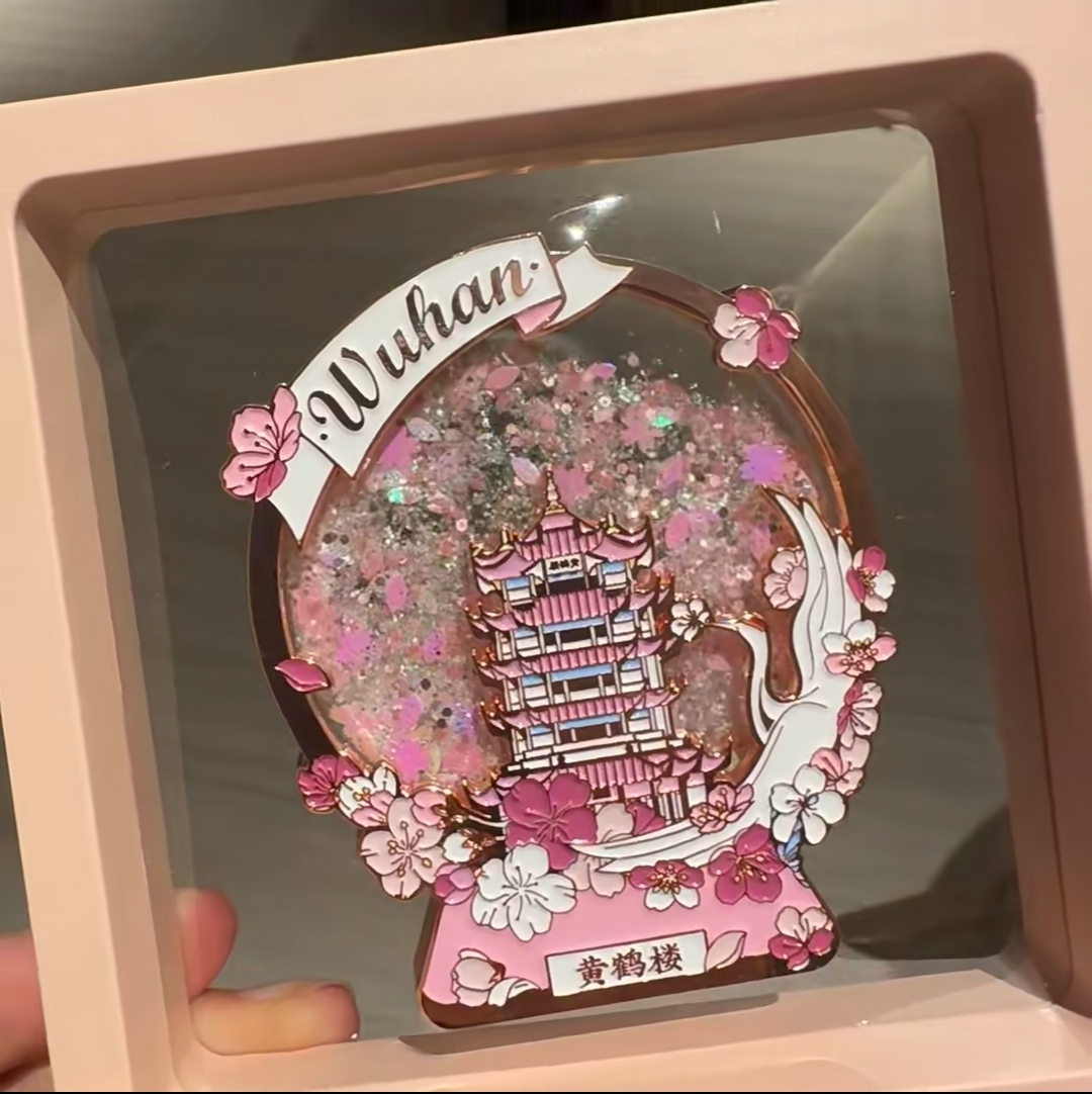 湖北樱花流沙冰箱贴是极具地域特色的文创佳品。它以武汉等地标建筑为设计核心,如黄鹤楼、武大樱花大道、东湖樱园等,将樱花元素与建筑巧妙融合。采用流沙工艺,粉色流沙搭配细小闪光粉,轻轻晃动,如樱花雨飘落,营造出梦幻唯美的视觉效果。材质上多选用金属或环保可降解材料,背面有磁吸设计。既美观又实用,不仅是旅游纪念的佳品,还能为家居增添一抹浪漫的湖北风情。