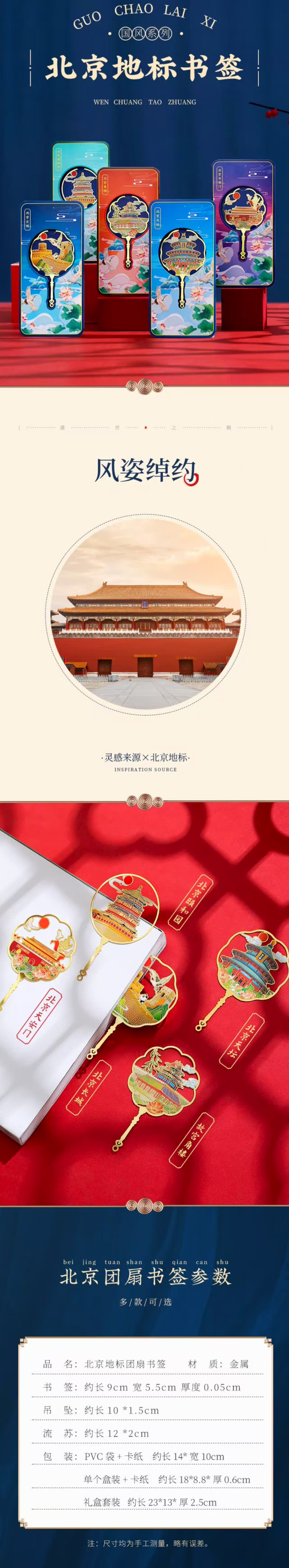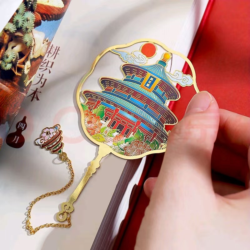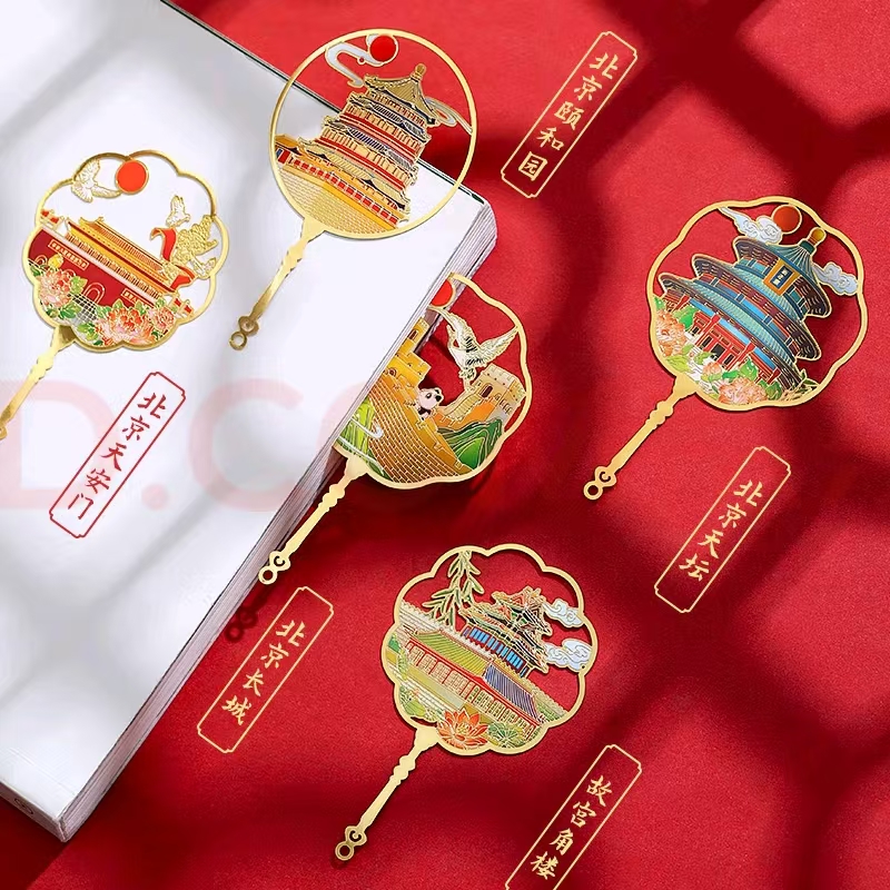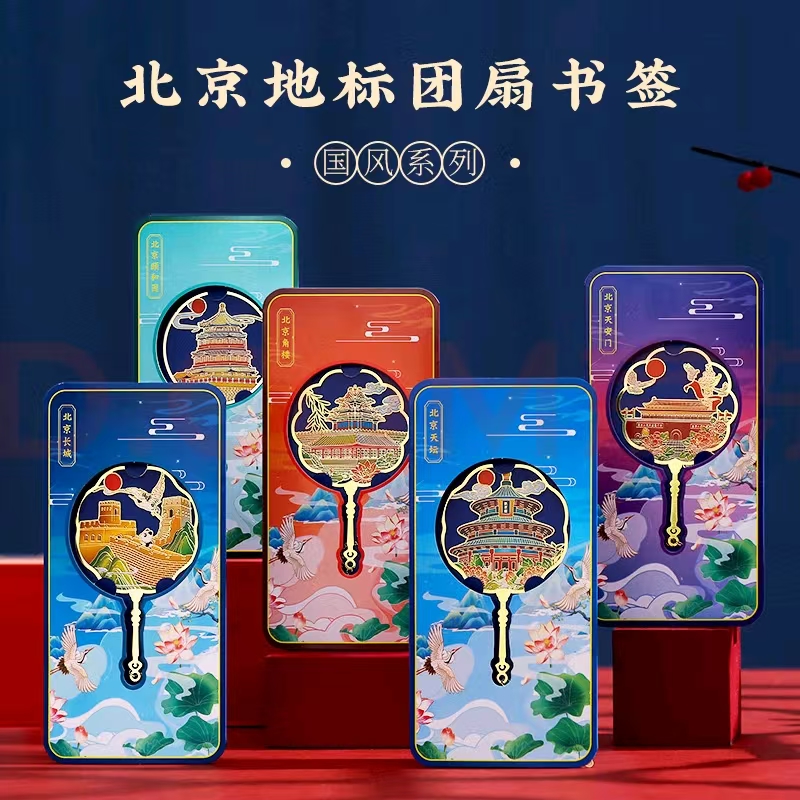 这款北京地标团扇书签以金属镀金和珐琅工艺打造,设计精美、色彩鲜艳。图案融合北京地标建筑与传统元素,既实用又具收藏价值。包装精美,适合自用或作为特色礼品。