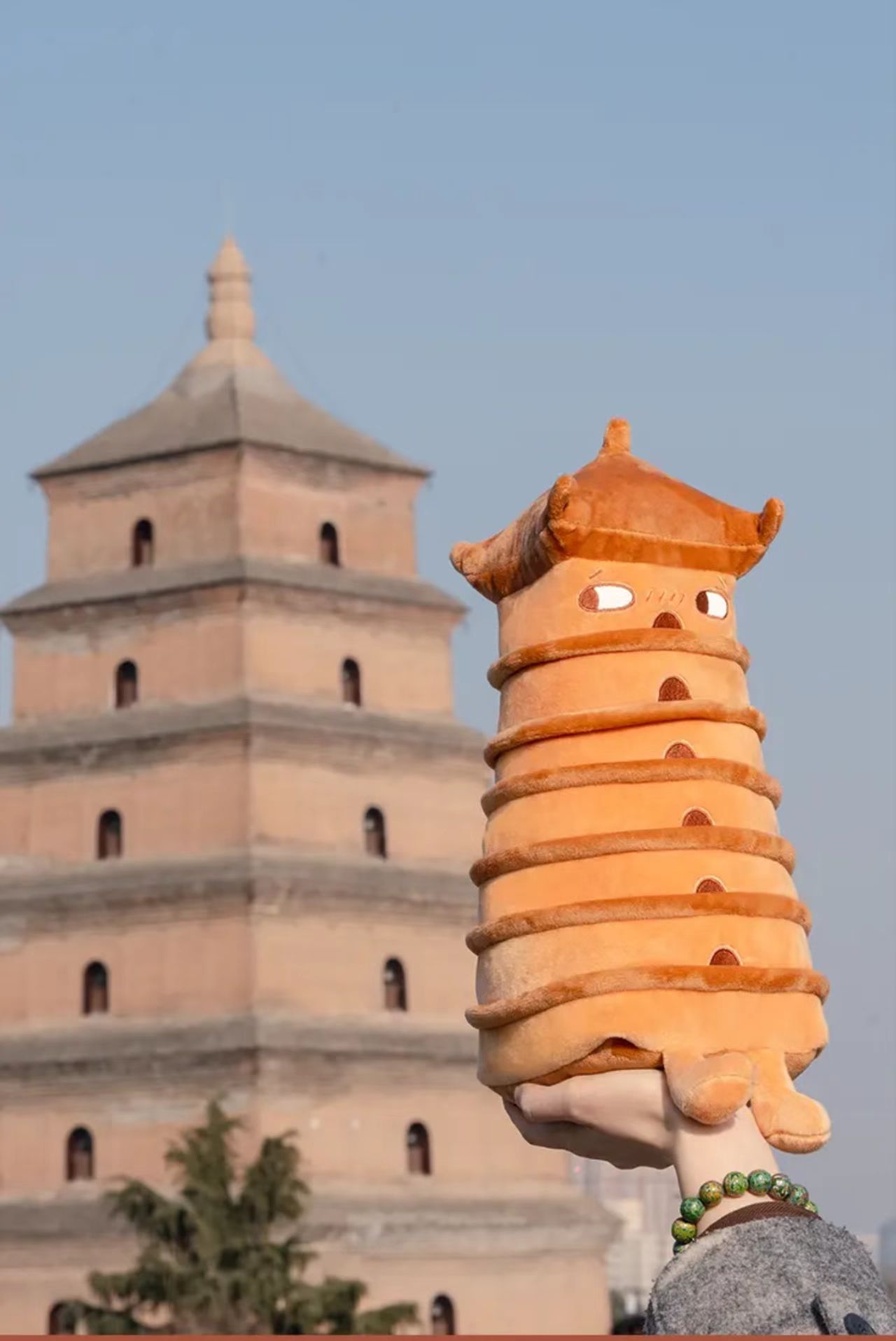 大雁塔化身记 ,鎏金塔刹化作呆萌头冠,青砖纹路演变为绒面肌理,朱红门廊藏在背包开口处。