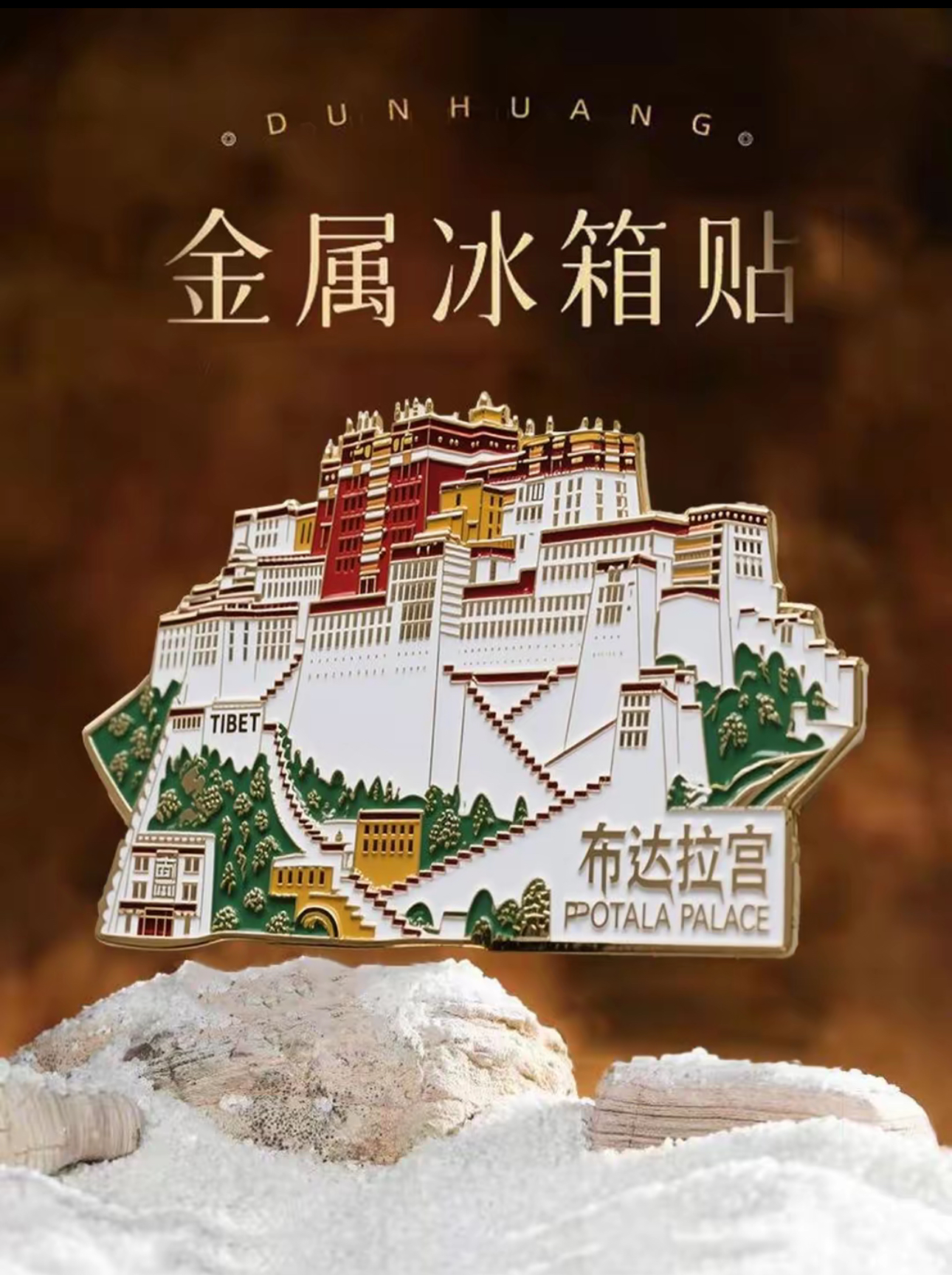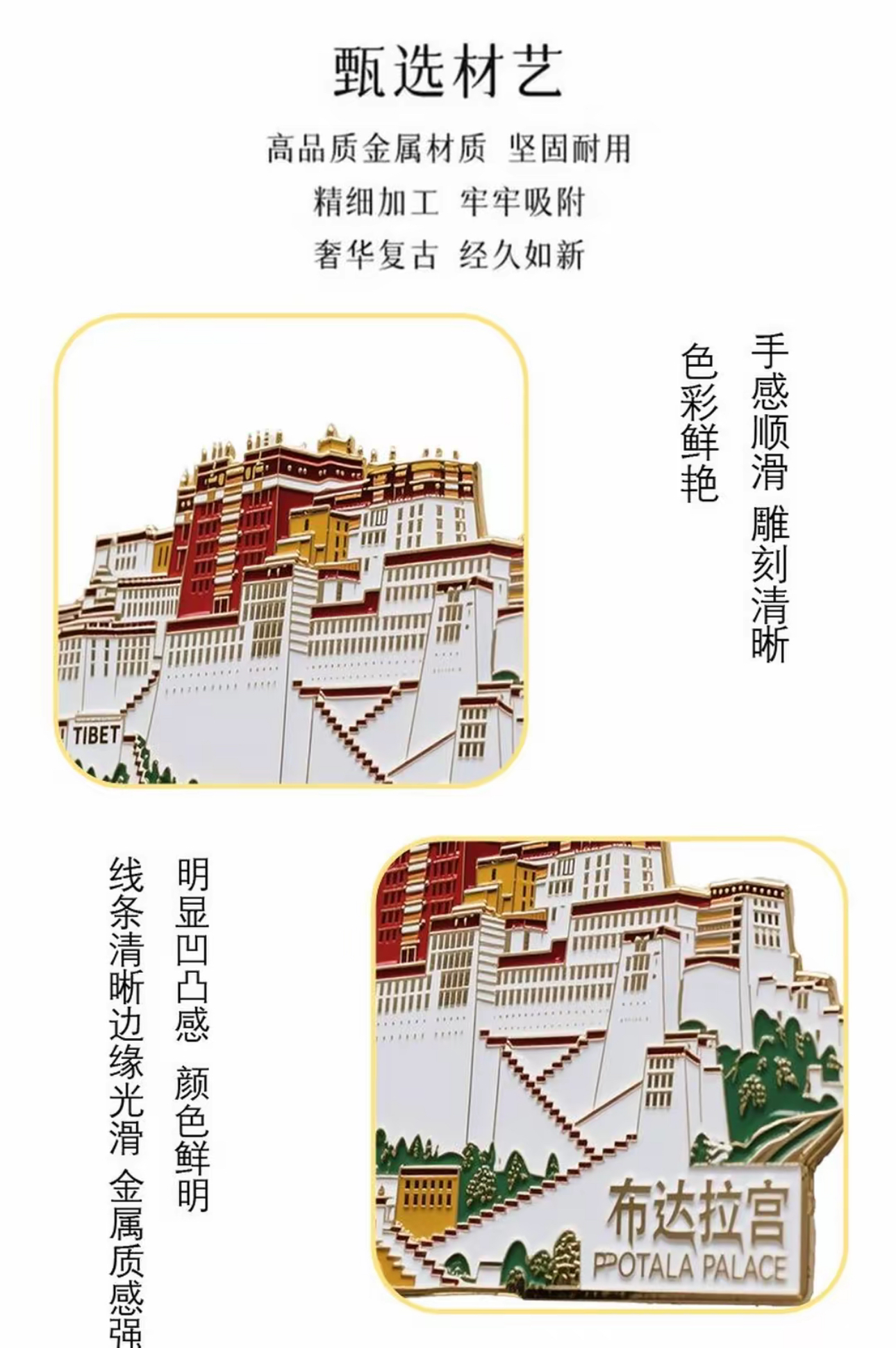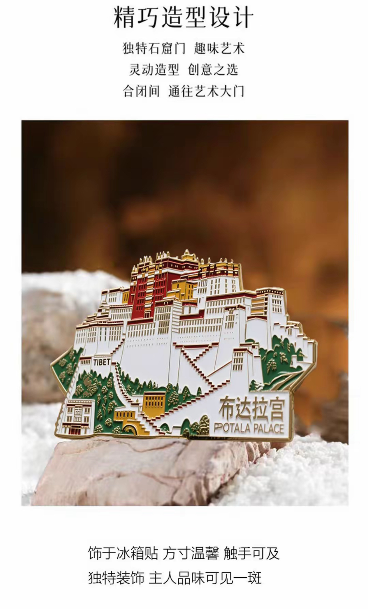 文化价值:属于西藏系列旅游纪念品,以布达拉宫为原型,具有浓厚的地域文化和历史底蕴,兼具创藏意义。产品品质:采用金属材质,工艺精细,色彩还原准度高,能精呈现布达拉宫的建筑风貌,质感优良。• 实用性:作为冰箱贴,可用于装饰家居,兼具实用性与观赏性,能为生活空间增添特色。
