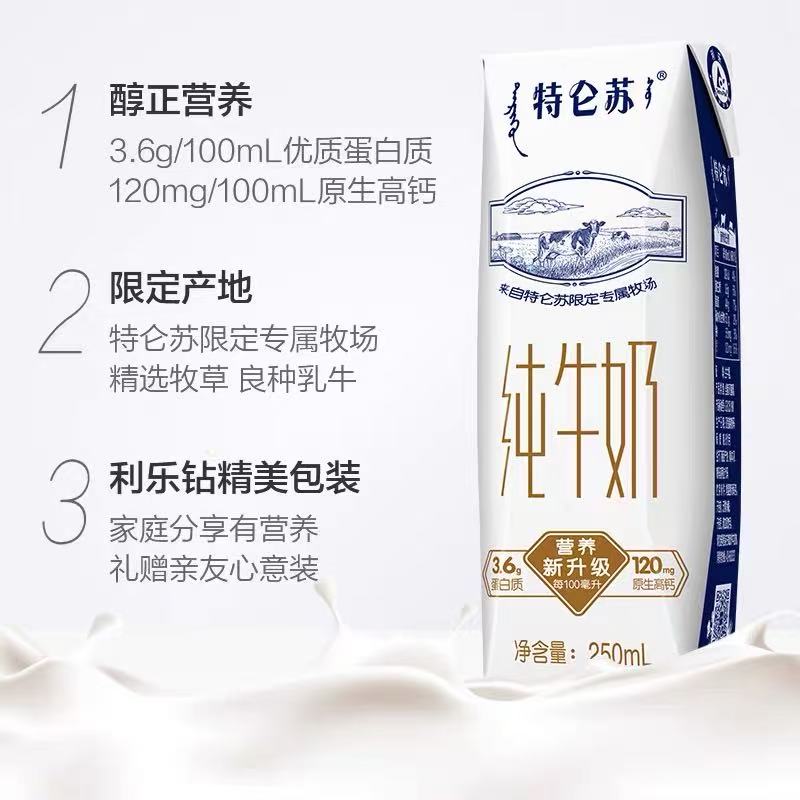特仑苏纯牛奶,源自北纬 40 度黄金奶源带专属牧场。每 100ml 含 3.6g 优质蛋白、120mg 原生高钙 ,口感浓郁丝滑,0 添加,品质经超 105 项检测把关。
