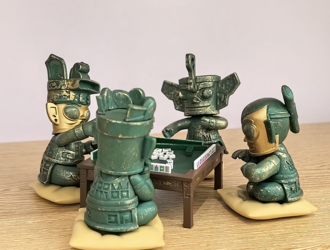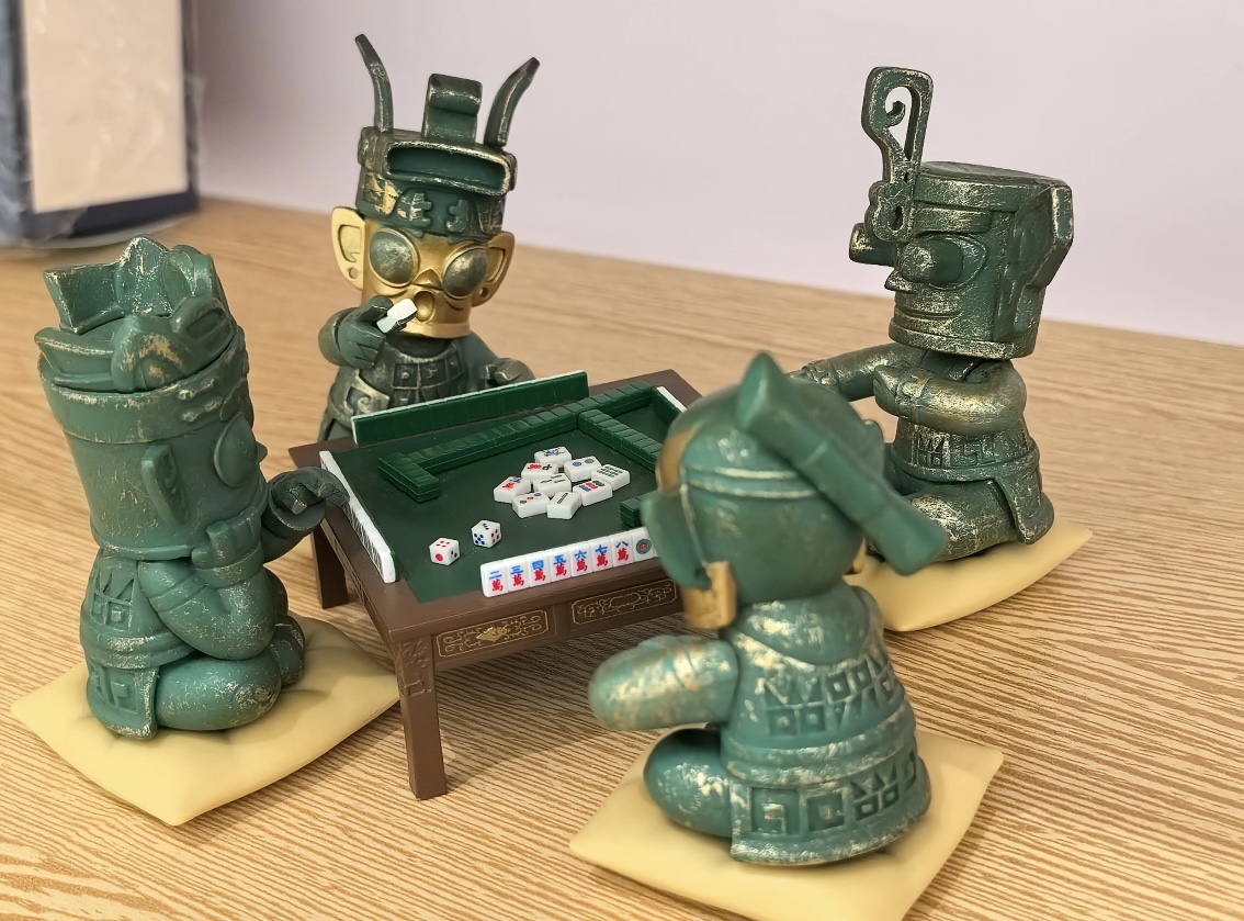 以Q版三星堆风格结界兽为核心形象,还原古蜀青铜质感的同时,赋予其憨态可掬的神态与动作。四只结界兽围坐麻将桌,搭配迷你麻将、骰子、筹码,生动呈现“打麻将”的趣味场景。