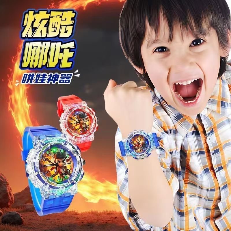 > 新款七彩闪灯魔童哪吒闹海敖丙儿童卡通手表男孩小学生发光手表