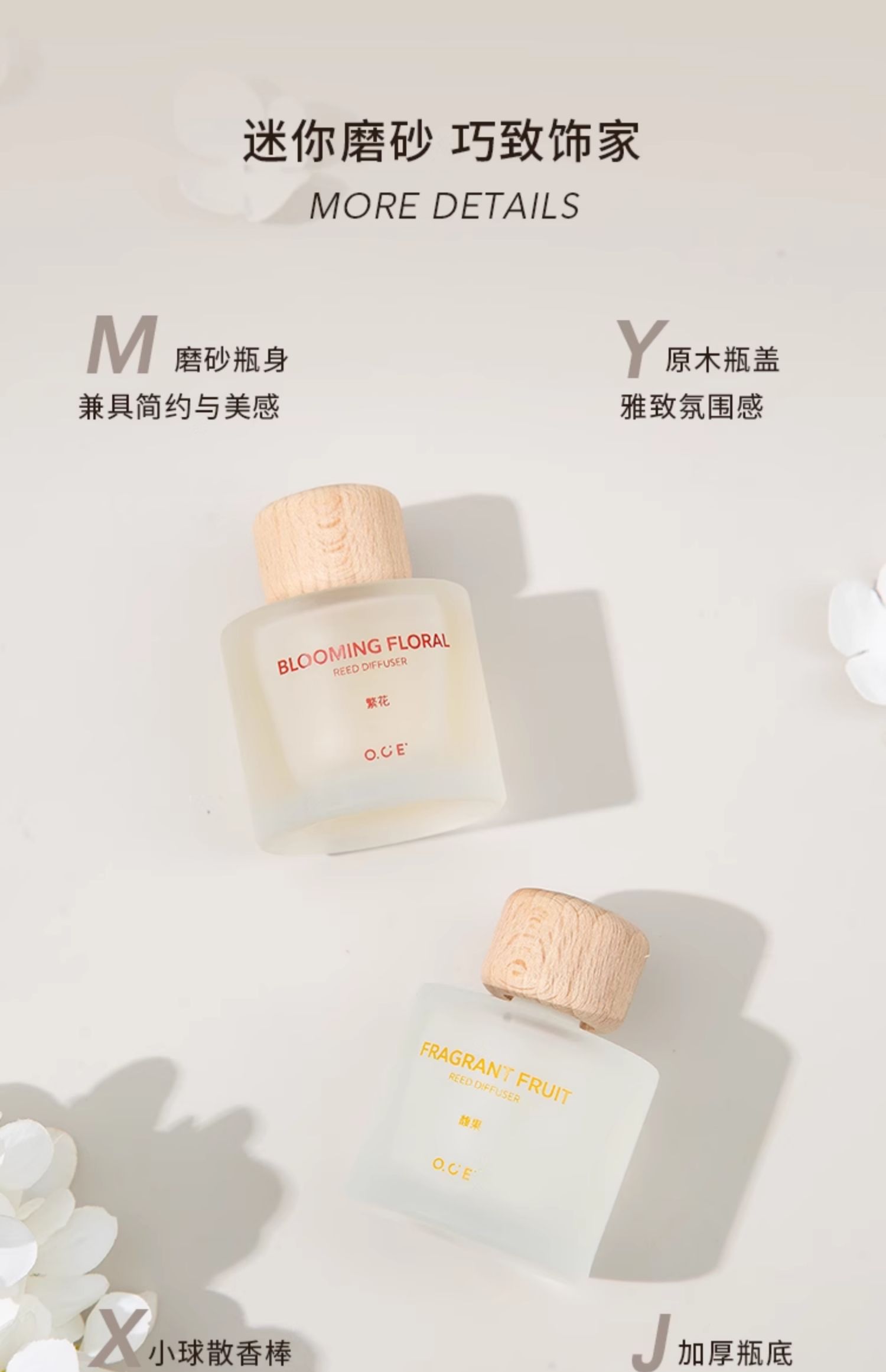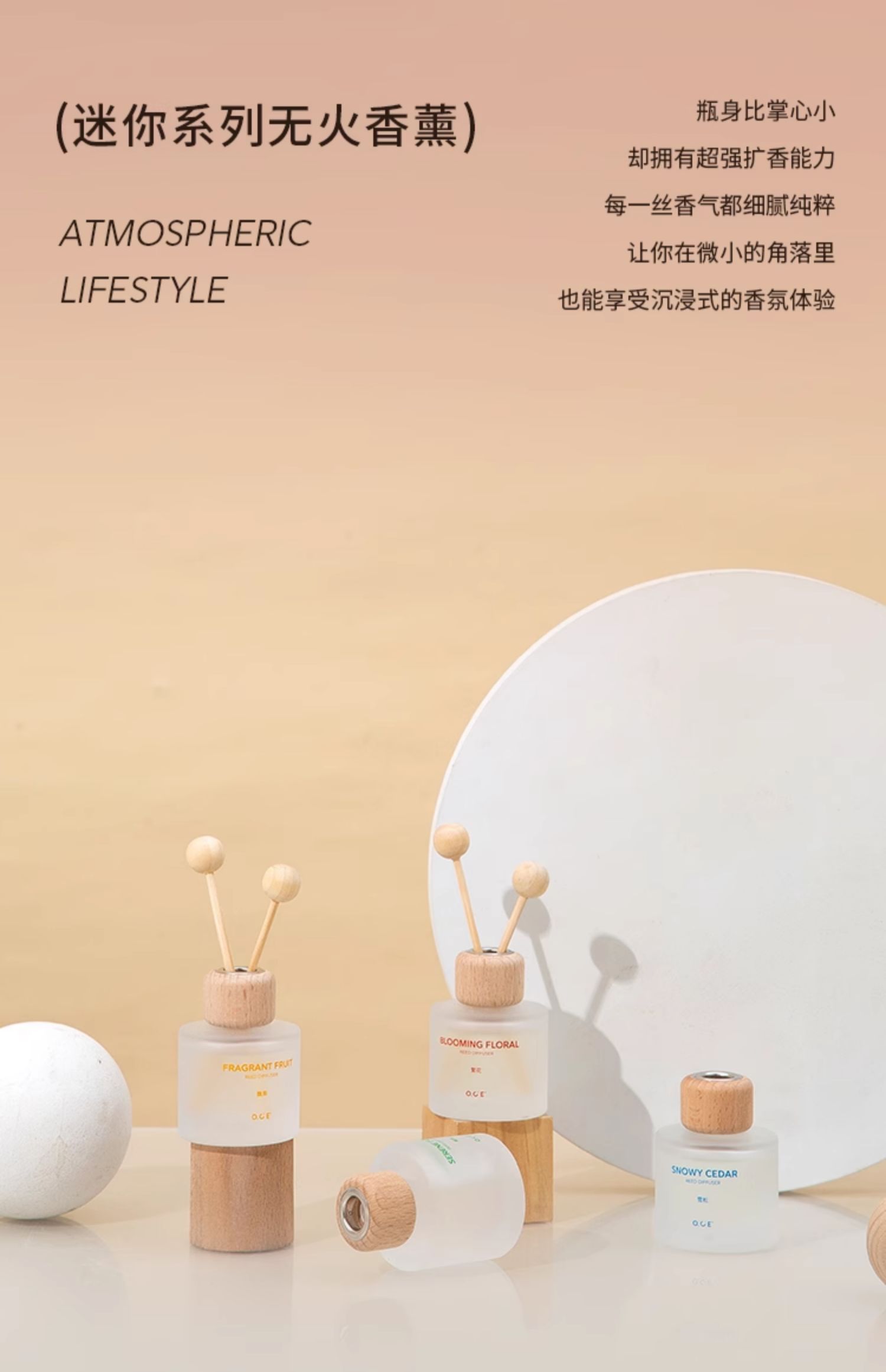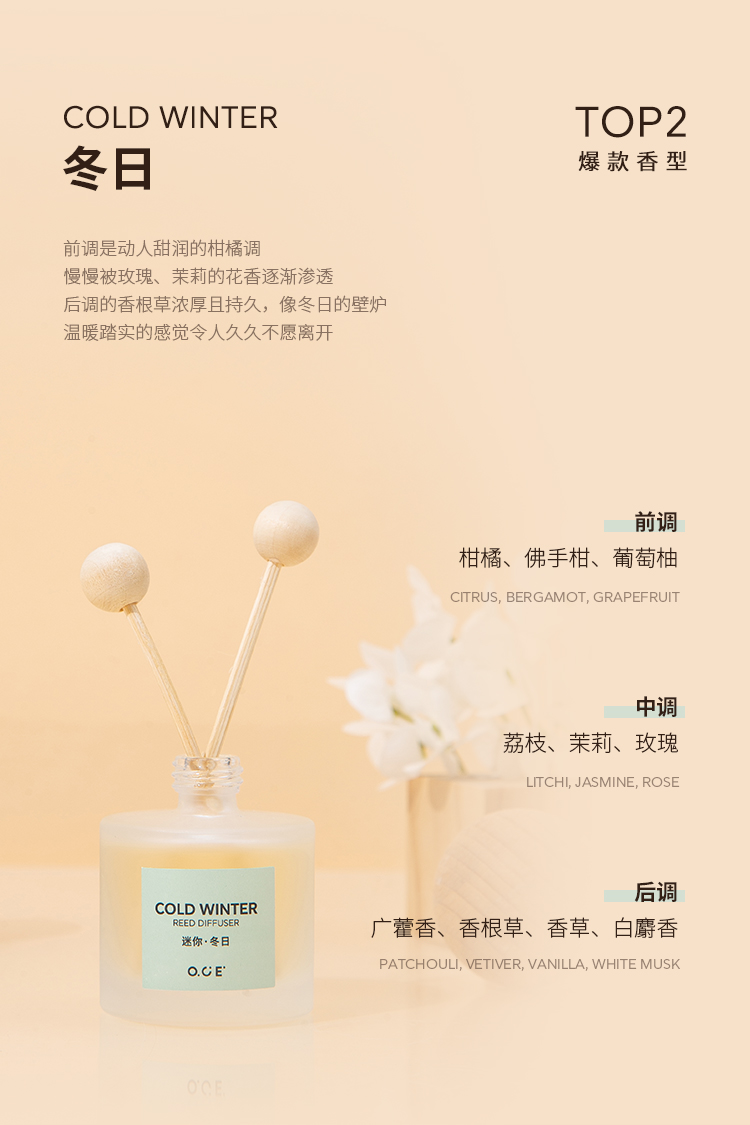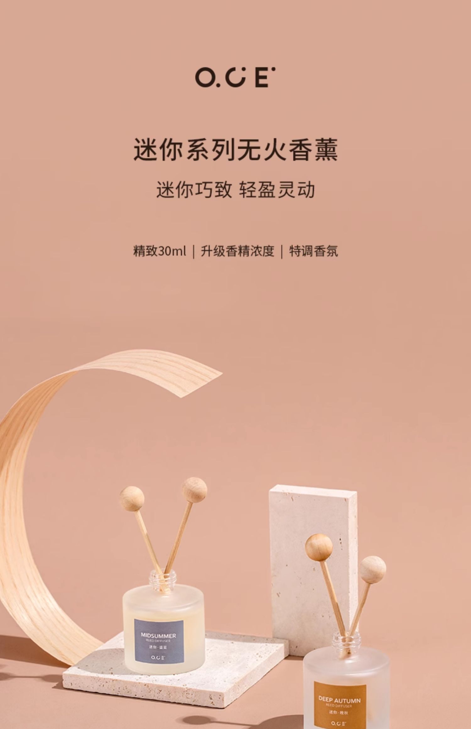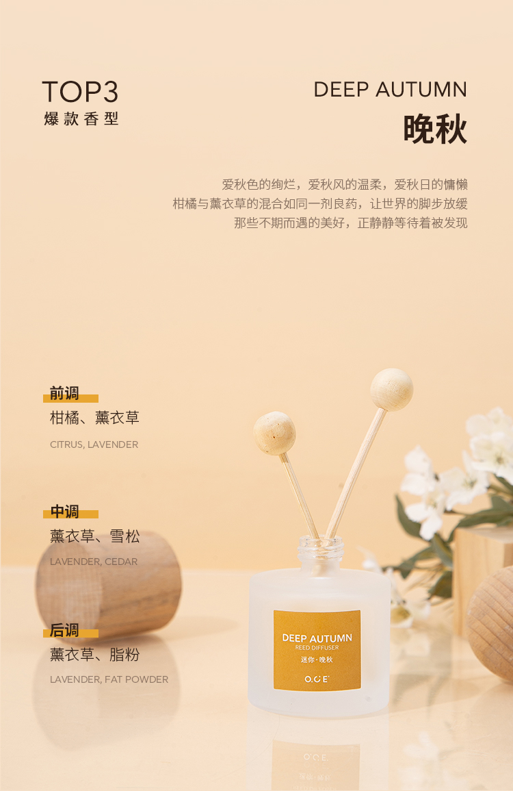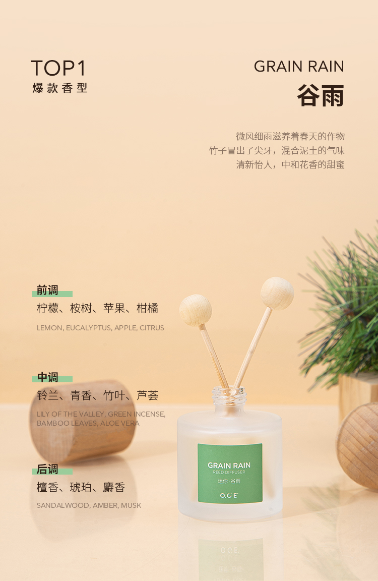 OCE出品,品牌保障,采用升级香精浓度,特调香氛,香气品质佳。迷你巧致30ml装,轻盈灵动,不占空间,是家居、车载的精致摆件。无火设计,避免明火隐患,使用更安全放心。