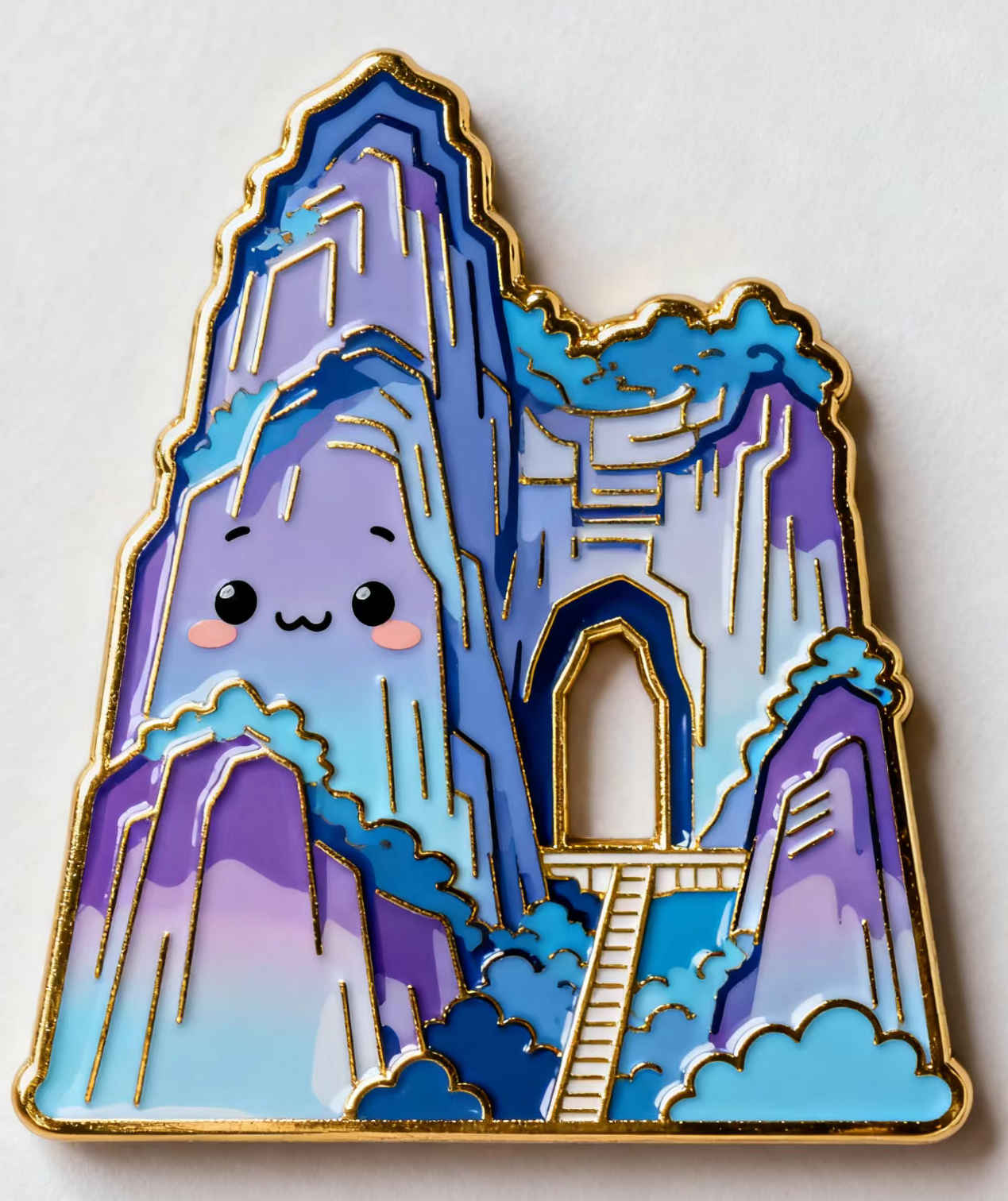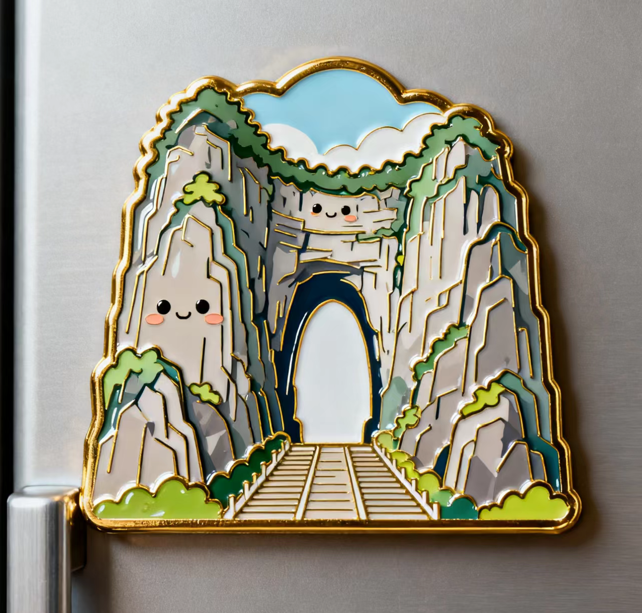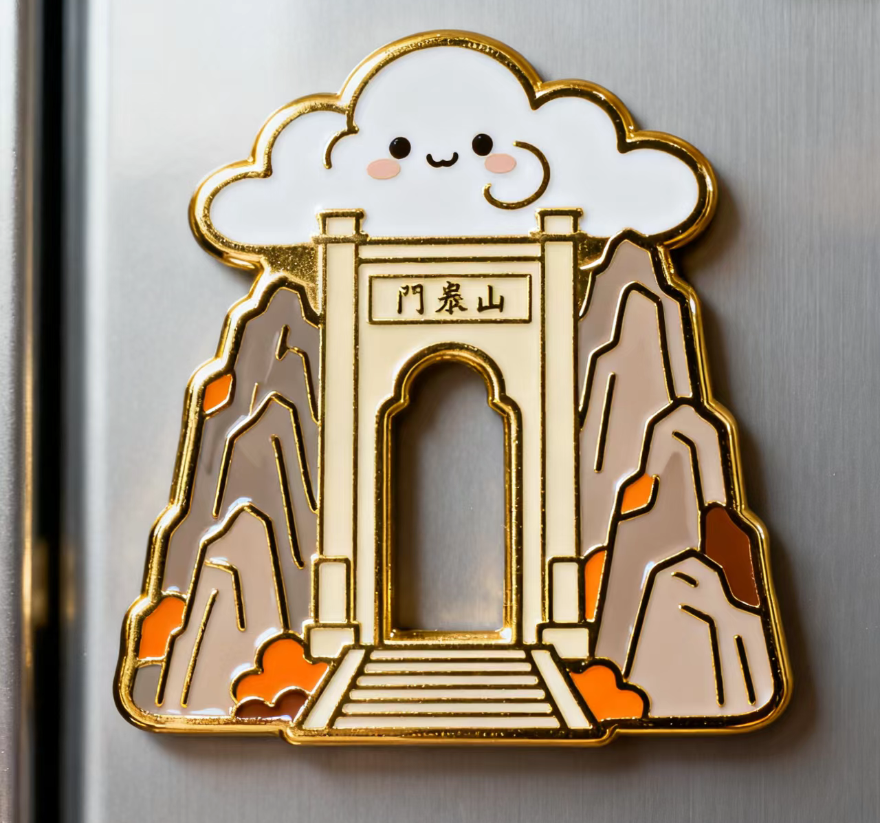 这是一款张家界天门山卡通冰箱贴,以萌趣拟人化设计呈现天门洞景观,金色包边精致,既是冰箱装饰,也是纪念张家界风光的文创小物。(找客服备注款式)