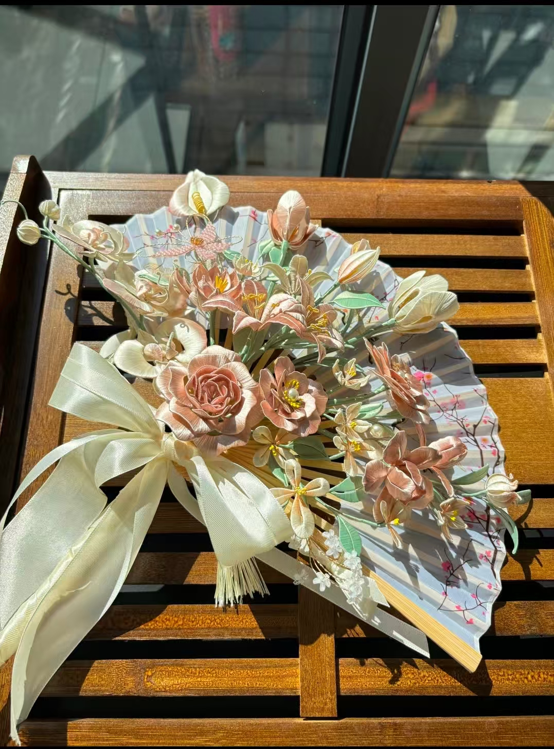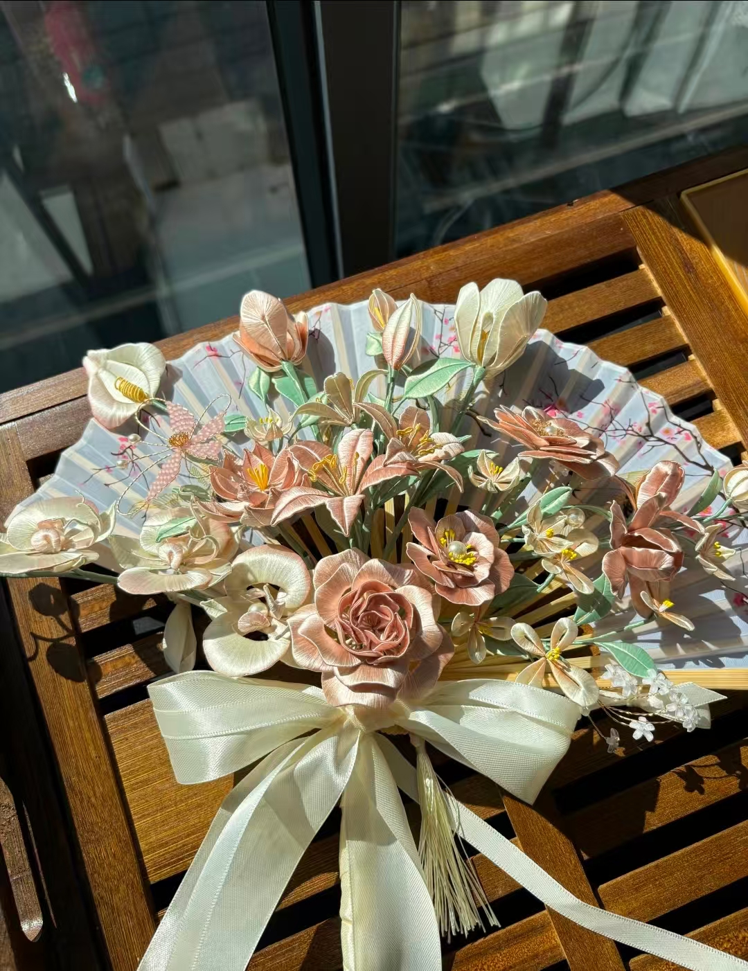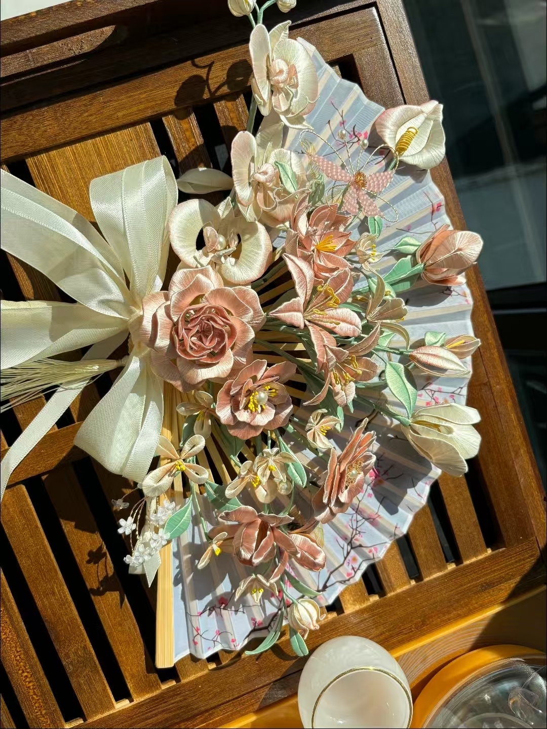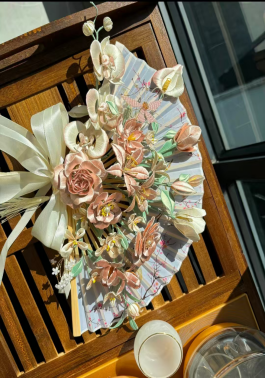 传承宋代缠花非遗技艺,以金属丝为骨、丝线缠绕成花,每一件都是匠人手工精制的艺术孤品。本作品,融合多类花卉造型,色彩柔和雅致,搭配丝绸扇面与蝴蝶结,古典与浪漫兼具,适配汉服、婚礼等场景,是穿搭与陈设的吸睛利器。承载传统工艺的细腻匠心,将东方花艺美学凝于指尖,既是实用配饰,更是可收藏的非遗文化载体,送礼或自藏皆显格调。