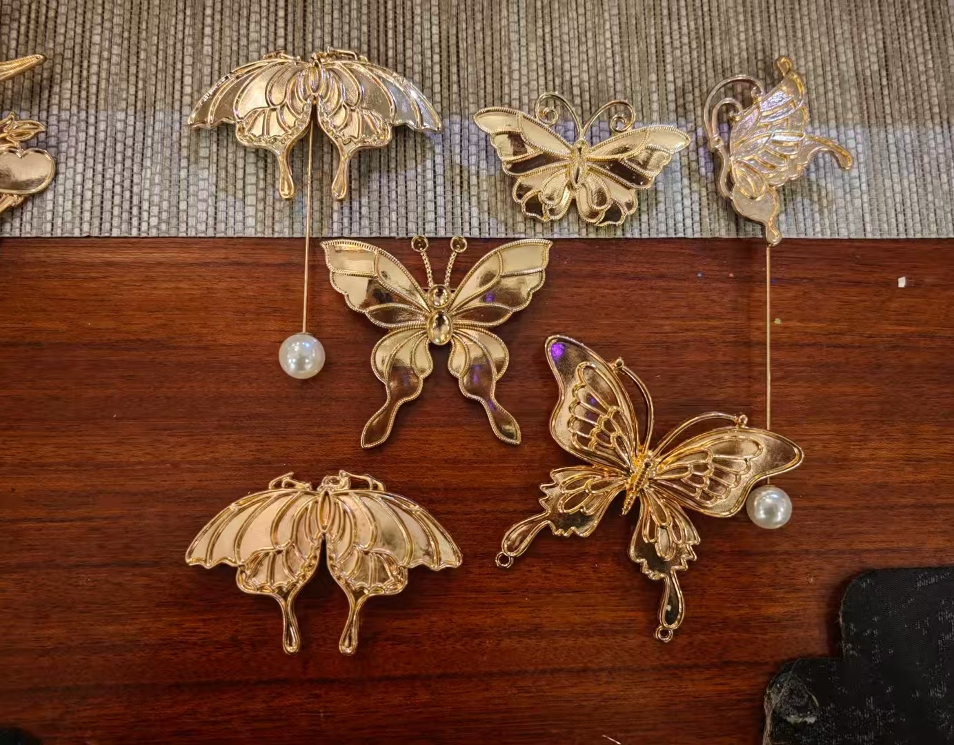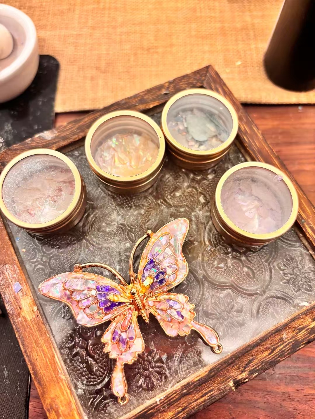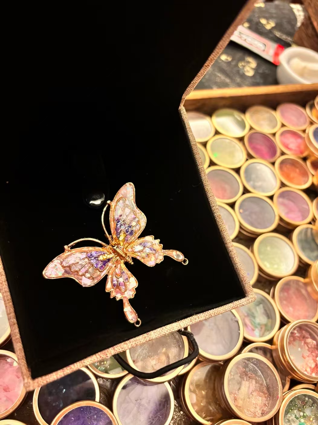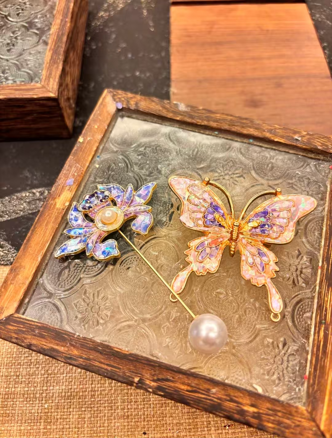 此胸针套装源自非遗花丝镶嵌工艺,该工艺传承千年,以“花丝”(金属细丝编织)与“镶嵌”(珠宝嵌入)为核心,是宫廷御用技艺的当代呈现,每一件都凝聚着匠人对传统工艺的坚守与创新。包含花卉款与蝴蝶款两款胸针。花卉款以典雅花型为底,中心镶嵌温润珍珠;蝴蝶款则模拟蝴蝶振翅的灵动姿态,色彩绚丽如流光溢彩,两款造型皆充满东方美学意韵。采用贵金属拉丝工艺塑造轮廓,搭配珐琅彩工艺呈现渐变色彩,花卉款中心与蝴蝶款细节处镶嵌天然珍珠,金属的光泽与珍珠的温润、珐琅的艳丽交织,尽显奢华质感。可别在西装、旗袍、汉服等服饰上,瞬间提升穿搭的精致感与文化格调,是日常通勤、宴会社交的点睛之笔。作为非遗工艺制品,它不仅是配饰,更是可收藏的文化载体,送礼时能传递对传统技艺的珍视,自用时可随时感受千年工艺的美学魅力。