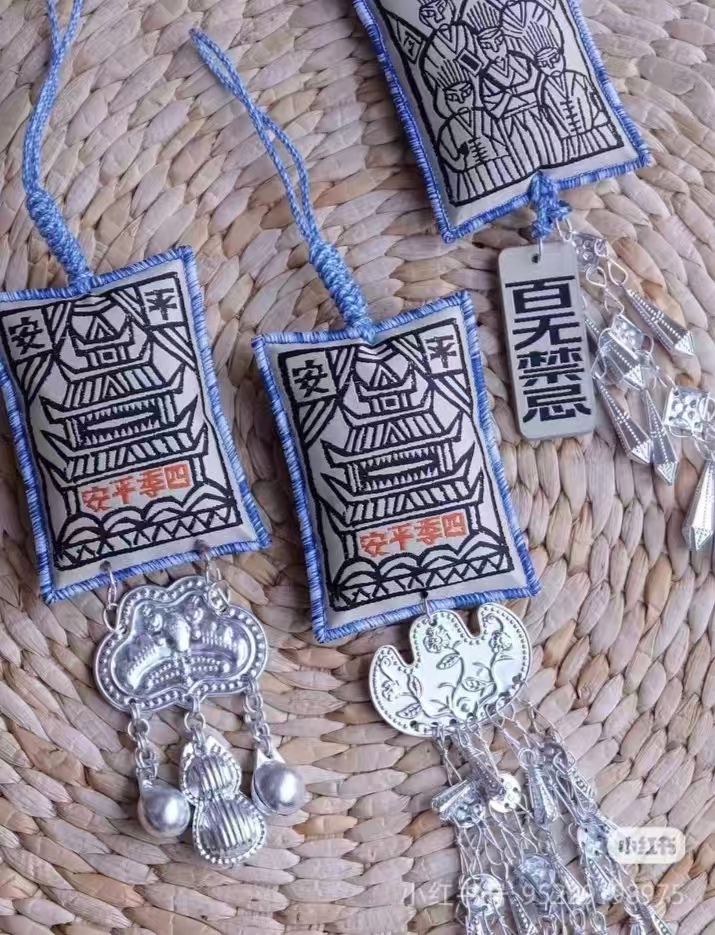这是云南特色的四季平安香囊。香囊主体绣有古朴的图案,如亭台楼阁,还绣有“平安”“四季平安”等字样,传递着美好的祝福。其下方垂挂着银质挂件,有云朵、葫芦等造型,增添了灵动和精致感。部分香囊还配有写着“天官赐福”“百无禁忌”的木牌。云南香囊不仅是精巧的装饰品,更承载着当地人民对平安喜乐生活的期盼,更是云南民俗文化的生动体现。